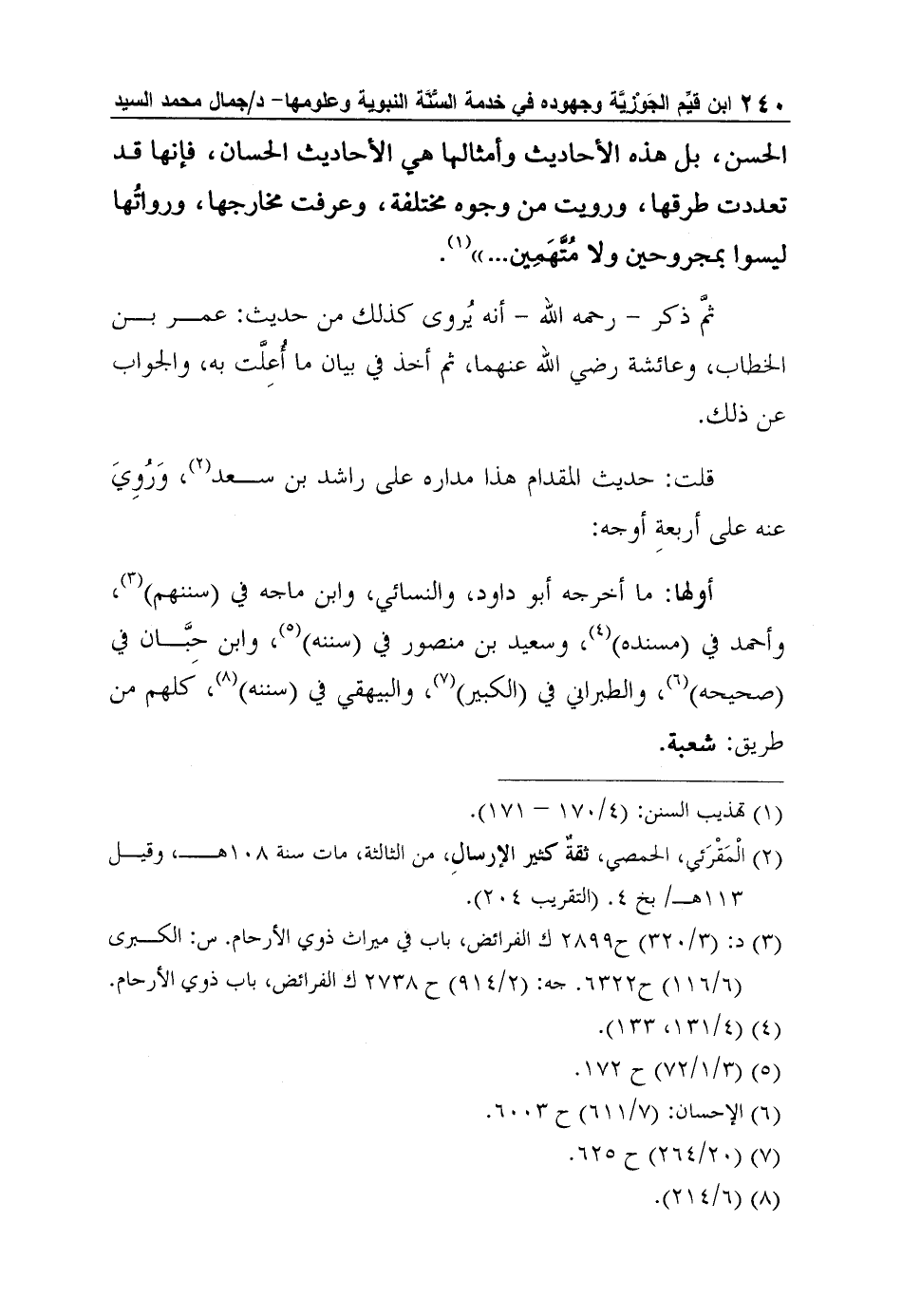 الحسن، بل هذه الأحاديث وأمثالها هي الأحاديث الحسان، فإنها قد تعددت طرقها، ورويت من وجوه مختلفة، وعرفت مخارجها، ورواتُها ليسوا بمجروحين ولا مُتَّهَمِين ... "1.