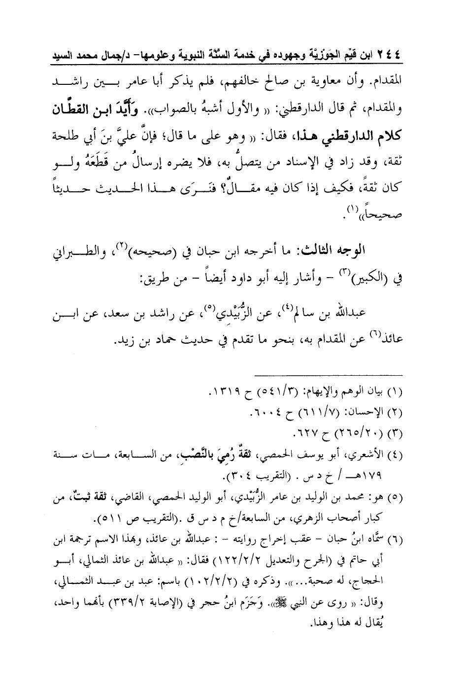 المقدام. وأن معاوية بن صالح خالفهم، فلم يذكر أبا عامر بين راشد والمقدام، ثم قال الدارقطني: "والأول أشبهُ بالصواب". وَأَيَّدَ ابن القطَّان كلام الدارقطني هذا، فقال: "وهو على ما قال؛ فإنَّ عليَّ بنَ أبي طلحة ثقة، وقد زاد في الإسناد من يتصلُّ به، فلا يضره إرسالُ من قَطَعَهُ ولو كان ثقةً، فكيف إذا كان فيه مقالٌ؟ فنَرَى هذا الحديث حديثاً صحيحاً"1.