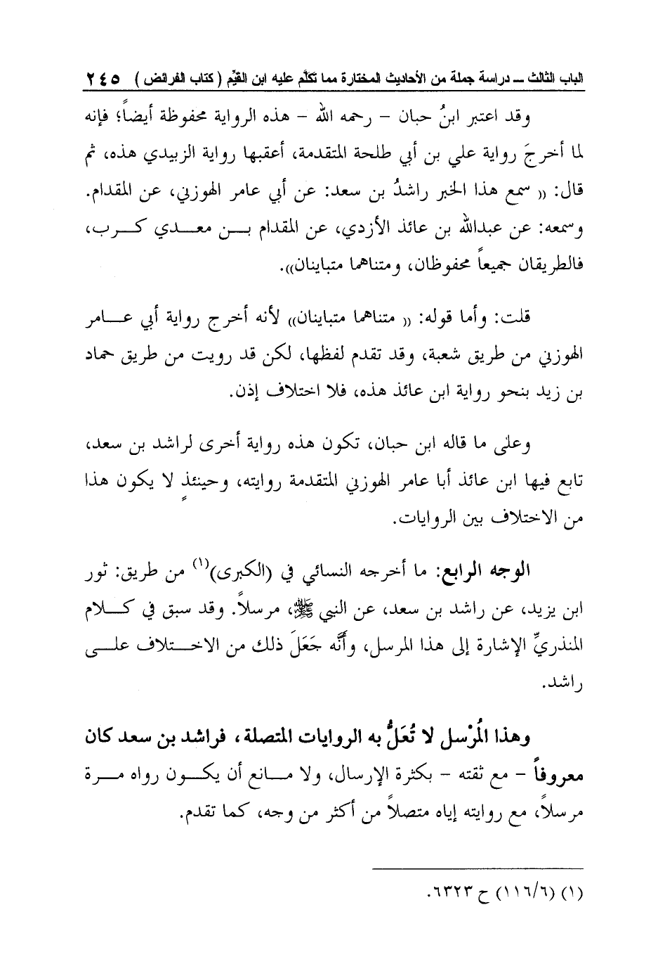 الوجه الرابع: ما أخرجه النسائي في (الكبرى) 1 من طريق: ثور ابن يزيد، عن راشد بن سعد، عن النبي صلى الله عليه وسلم، مرسلاً. وقد سبق في كلام المنذريِّ الإشارة إلى هذا المرسل، وأَنَّه جَعَلَ ذلك من الاختلاف على راشد.