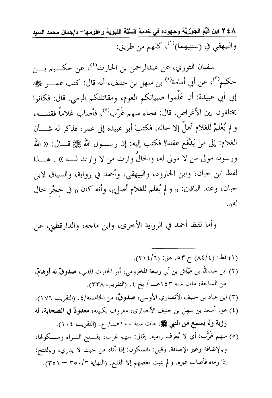 والبيهقي في (سننيهما) 1، كلهم من طريق: سفيان الثوري، عن عبد الرحمن بن الحارث2، عن حكيم بن حكيم3، عن أبي أمامة4 بن سهل بن حنيف، أنه قال: كتب عمر رضي الله عنه إلى أبي عبيدة: أن عَلِّموا صبيانكم العوم، ومقاتلتكم الرمي. قال: فكانوا يختلفون بين الأغراض. قال: فجاء سهم غَرْب5، فأصاب غلاماً فقتله، ولم يُعْلَمْ للغلام أهلٌ إلا خاله، فكتبَ أبو عبيدة إلى عمر، فذكر له شأن الغلام: إلى من يَدْفَع عقله؟ فكتب إليه: إن رسول الله صلى الله عليه وسلم قال: "الله ورسوله مولى من لا مولى له، والخالُ وارث من لا وارث له". هذا لفظ ابن حبان، وابن الجارود، والبيهقي، وأحمد في رواية، والسياق لابن حبان، وعند الباقين: "ولم يُعلم للغلام أصل"، وأنه كان "في حِجْرِ خال له".