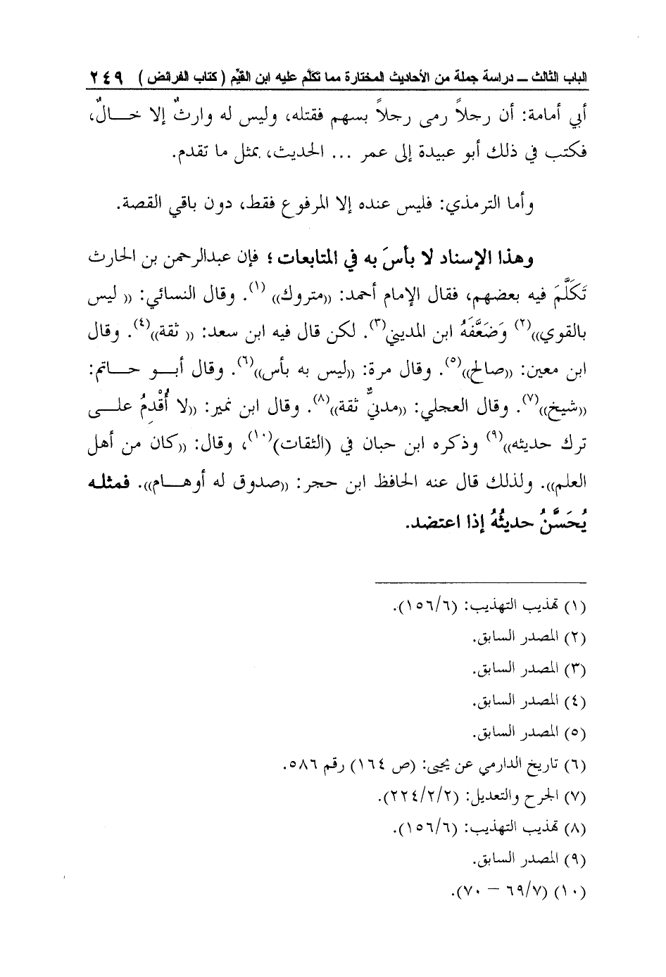 وهذا الإسناد لا بأسَ به في المتابعات؛ فإن عبد الرحمن بن الحارث تَكَلَّمَ فيه بعضهم، فقال الإمام أحمد: "متروك"1. وقال النسائي: "ليس بالقوي"2 وَضَعَّفَهُ ابن المديني3. لكن قال فيه ابن سعد: "ثقة"4. وقال ابن معين: "صالح"5. وقال مرة: "ليس به بأس"6. وقال أبو حاتم: "شيخ"7. وقال العجلي: "مدنيٌّ ثقة"8. وقال ابن نمير: "لا أُقْدِمُ على ترك حديثه"9 وذكره ابن حبان في (الثقات) 10، وقال: "كان من أهل العلم". ولذلك قال عنه الحافظ ابن حجر: "صدوق له أوهام". فمثله يُحَسَّنُ حديثُهُ إذا اعتضد.