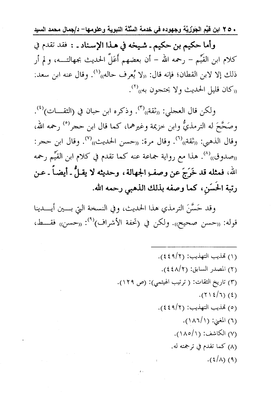وأما حكيم بن حكيم - شيخه في هذا الإسناد -: فقد تقدم في كلام ابن القَيِّم - رحمه الله - أن بعضهم أَعَلَّ الحديث بجهالته، ولم أر ذلك إلا لابن القطان؛ فإنه قال: "لا يُعرف حاله"1. وقال عنه ابن سعد: "كان قليل الحديث ولا يحتجون به"2.