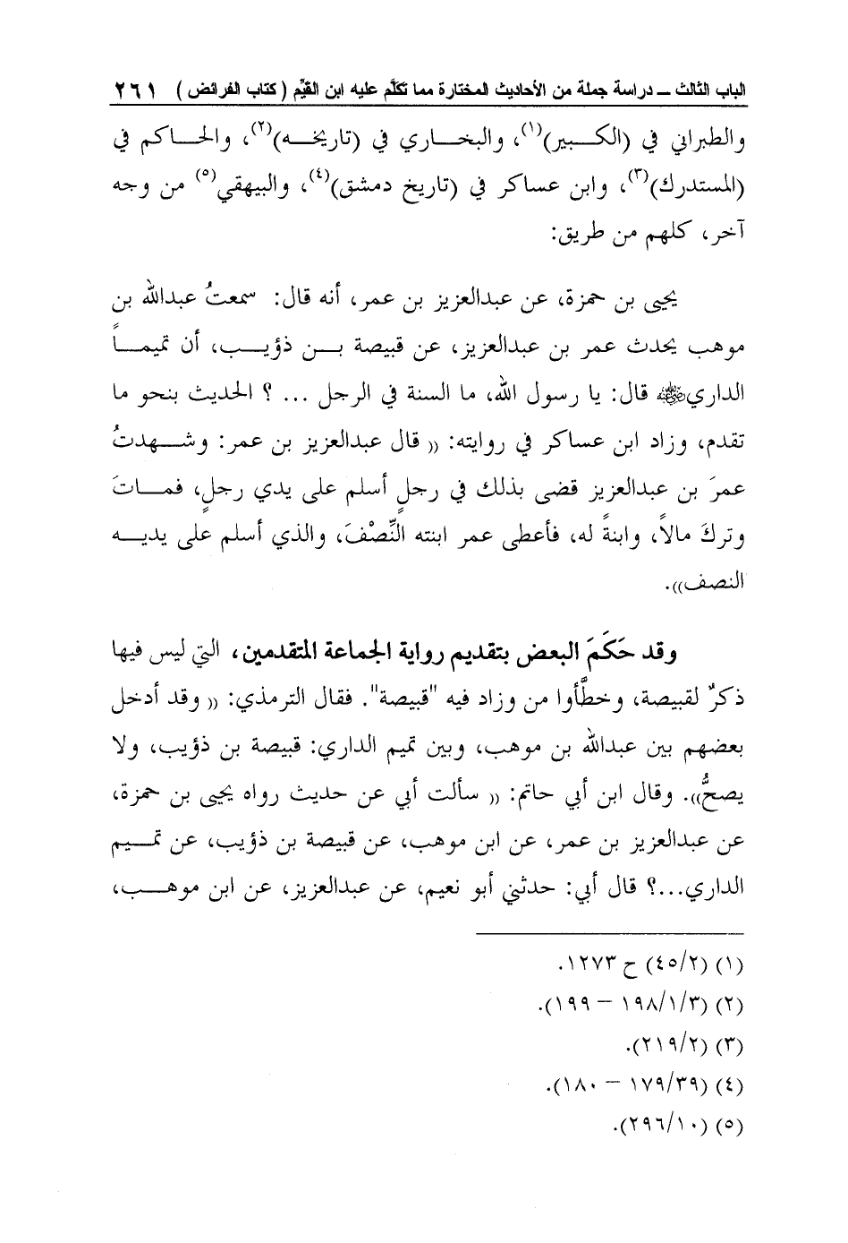 والطبراني في (الكبير) 1، والبخاري في (تاريخه) 2، والحاكم في (المستدرك) 3، وابن عساكر في (تاريخ دمشق) 4، والبيهقي5 من وجه آخر، كلهم من طريق: يحيى بن حمزة، عن عبد العزيز بن عمر، أنه قال: سمعتُ عبد الله بن موهب يحدث عمر بن عبد العزيز، عن قبيصة بن ذؤيب، أن تميماً الداري رضي الله عنه قال: يا رسول الله، ما السنة في الرجل ... ؟ الحديث بنحو ما تقدم، وزاد ابن عساكر في روايته: "قال عبد العزيز بن عمر: وشهدتُ عمرَ بن عبد العزيز قضى بذلك في رجلٍ أسلم على يدي رجلٍ، فماتَ وتركَ مالاً، وابنةً له، فأعطى عمر ابنته النِّصْفَ، والذي أسلم على يديه النصف".