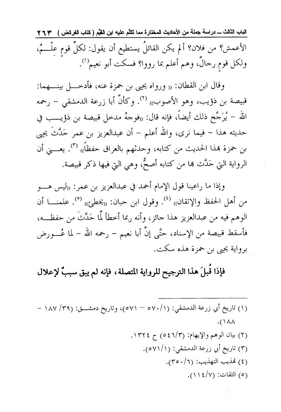 وإذا ما راعينا قول الإمام أحمد في عبد العزيز بن عمر: "ليس هو من أهل الحفظ والإتقان"4. وقول ابن حبان: "يخطئ"5. علمنا أن الوهم فيه من عبد العزيز هذا جائز، وأنه ربما أخطأ لمَّا حَدَّثَ من حفظه، فأسقط قبيصة من الإسناد، حتَّى إنَّ أبا نعيم - رحمه الله - لما عُورض برواية يحيى بن حمزة هذه سكت.