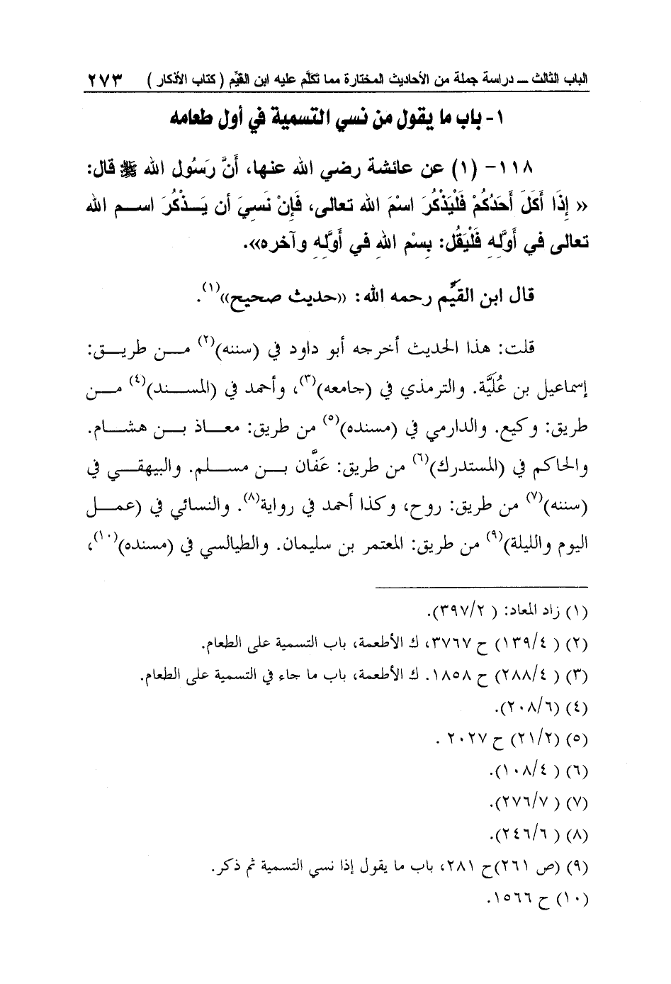 118- (1) عن عائشة رضي الله عنها، أَنَّ رَسُول الله صلى الله عليه وسلم قال: "إِذَا أَكَلَ أَحَدُكُمْ فَلْيَذْكُرَ اسْمَ الله تعالى، فَإِنْ نَسِيَ أن يَذْكُرَ اسم الله تعالى في أَوَّلِهِ فَلْيَقُل: بِسْم اللهِ في أَوَّلِهِ وآخره".