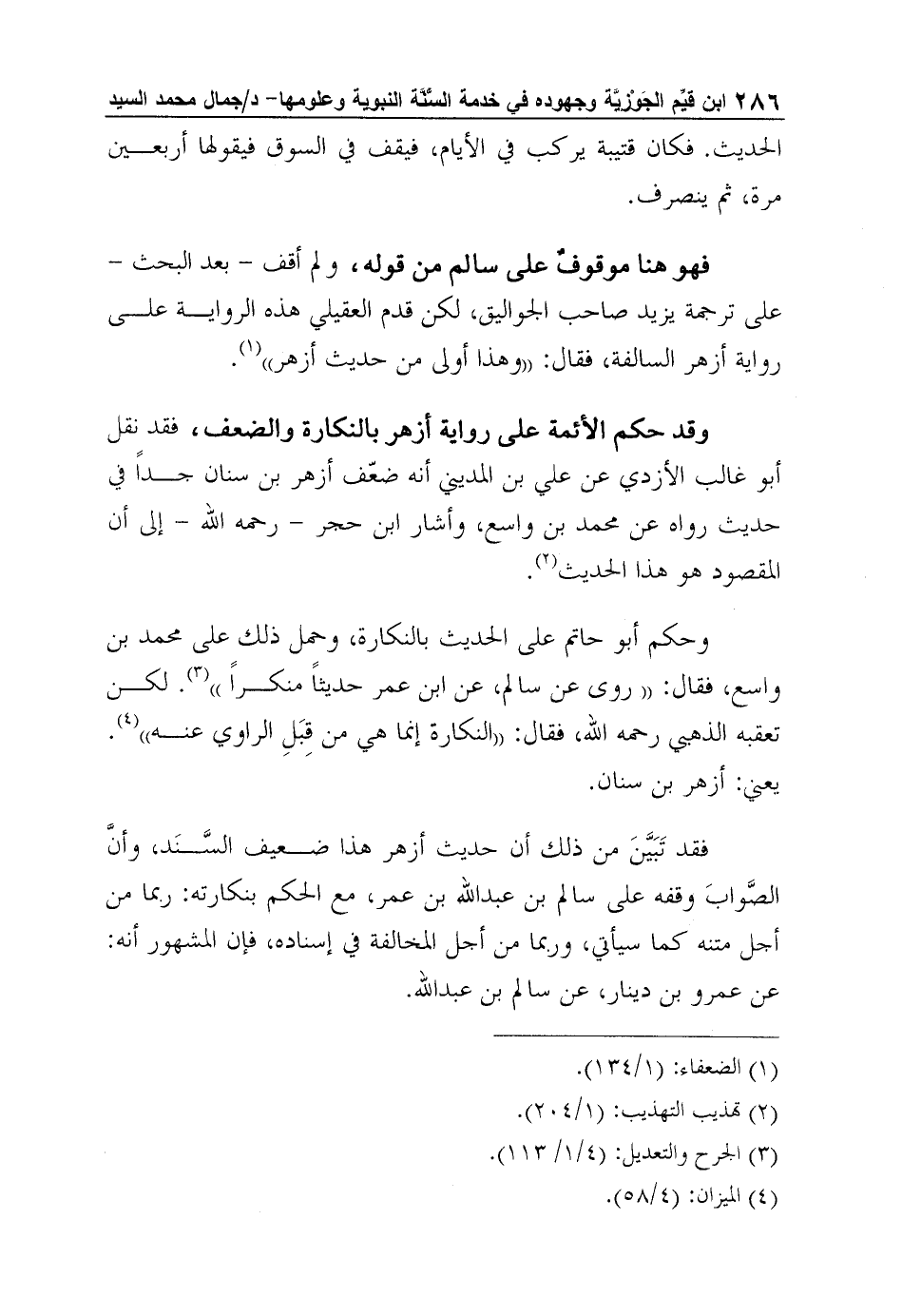 فهو هنا موقوفٌ على سالم من قوله، ولم أقف - بعد البحث - على ترجمة يزيد صاحب الجواليق، لكن قدم العقيلي هذه الرواية على رواية أزهر السالفة، فقال: "وهذا أولى من حديث أزهر"1.