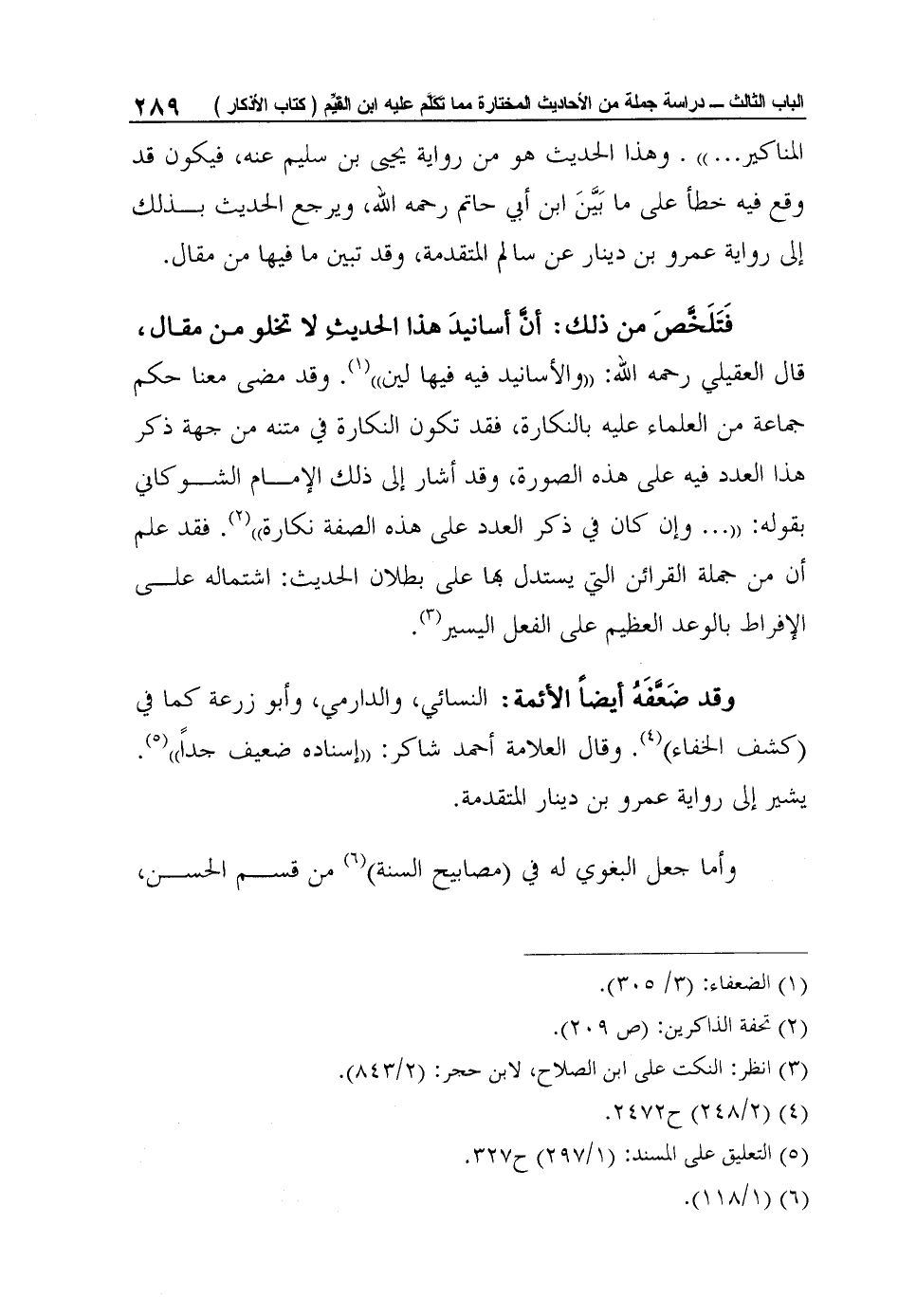 وقد ضَعَّفَهُ أيضاً الأئمة: النسائي، والدارمي، وأبو زرعة كما في (كشف الخفاء) 4. وقال العلامة أحمد شاكر: "إسناده ضعيف جداً"5. يشير إلى رواية عمرو بن دينار المتقدمة.
