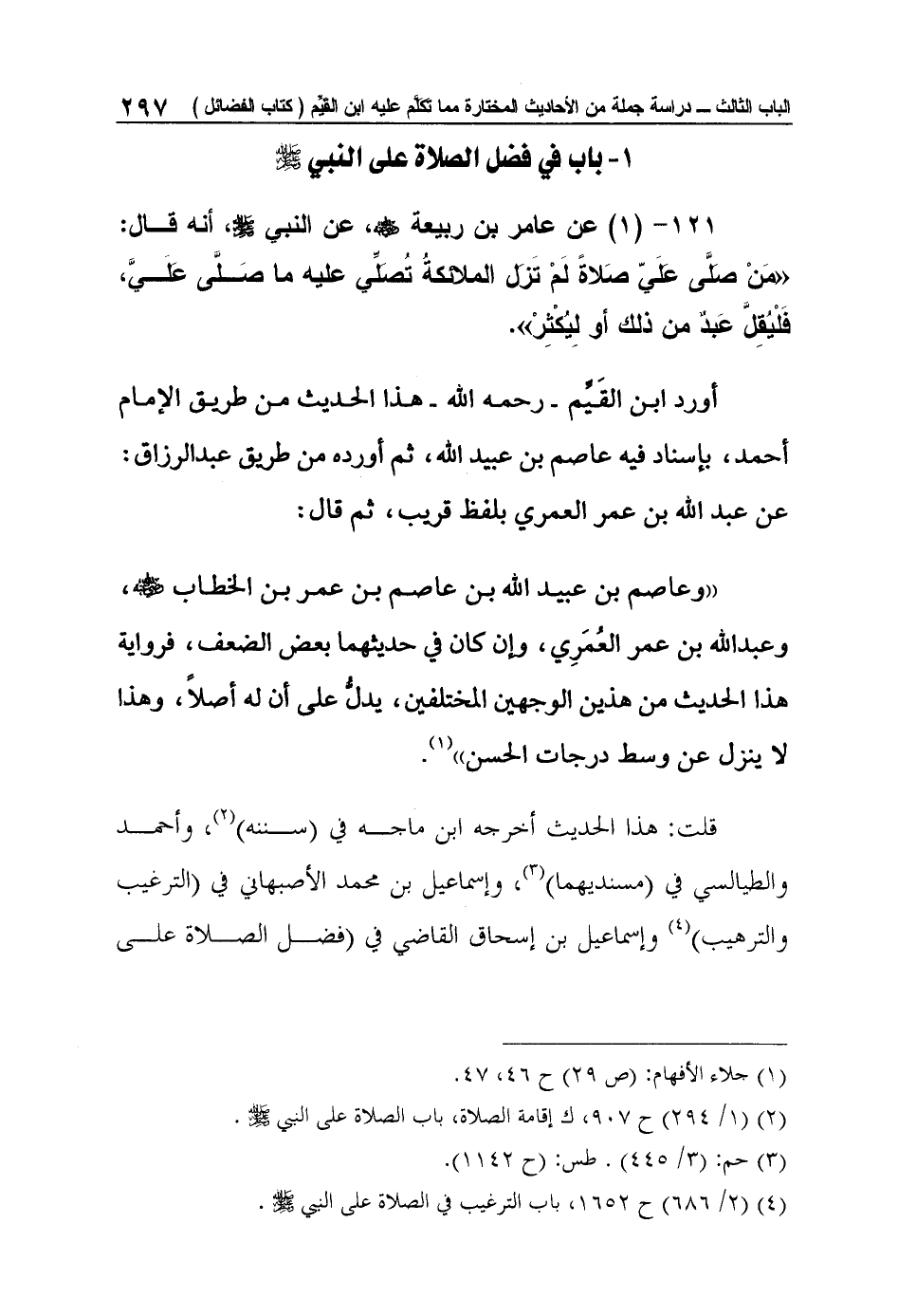 121- (1) عن عامر بن ربيعة رضي الله عنه، عن النبي صلى الله عليه وسلم، أنه قال: "مَنْ صَلَّى عَلَيّ صَلاةً لَمْ تَزَل الملائكةُ تُصَلِّي عليه ما صَلَّى عَلَيَّ، فَلْيُقِلَّ عَبدٌ من ذلك أو لِيُكْثِرْ".