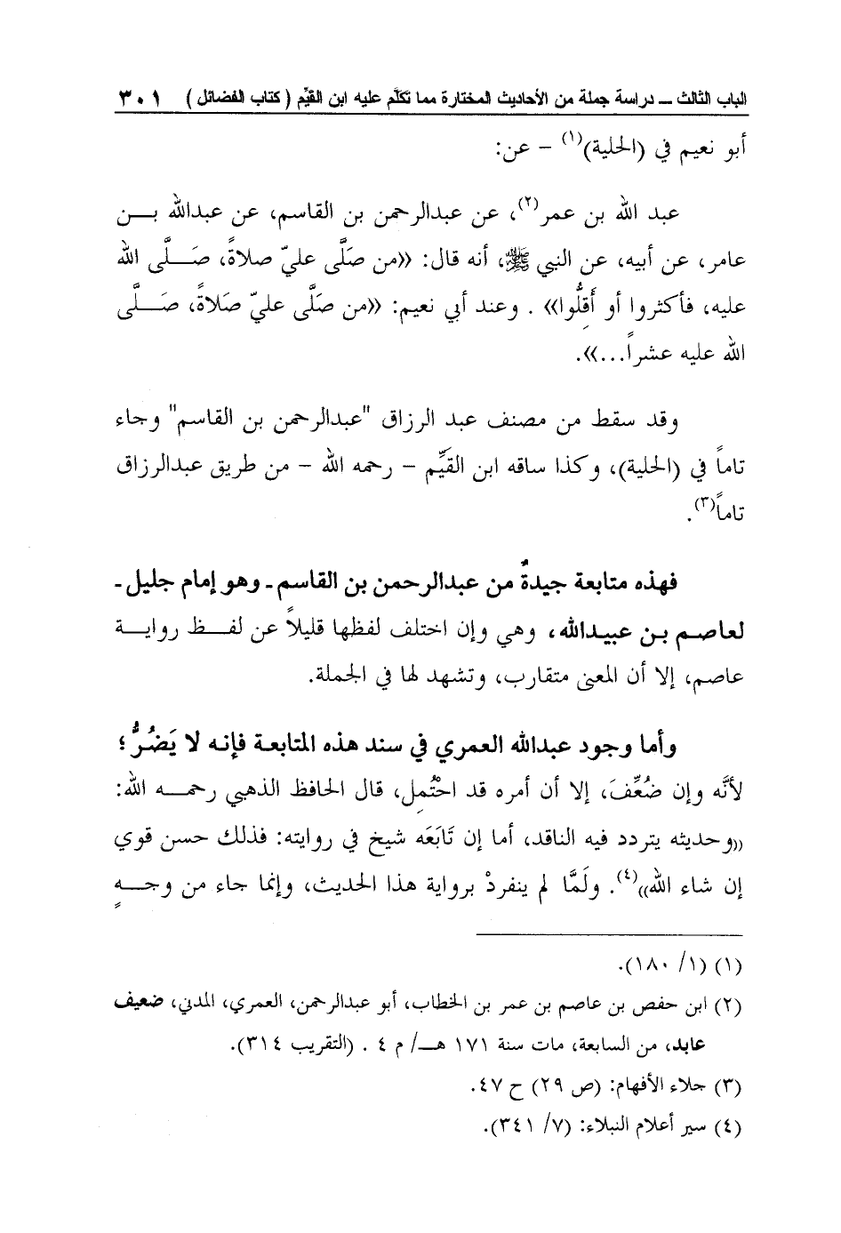 عبد الله بن عمر2، عن عبد الرحمن بن القاسم، عن عبد الله بن عامر، عن أبيه، عن النبي صلى الله عليه وسلم، أنه قال: "من صَلَّى عليّ صلاةً، صَلَّى الله عليه، فأكثروا أو أَقِلُّوا". وعند أبي نعيم: "من صَلَّى عليّ صَلاةً، صَلَّى الله عليه عشراً ... ".
