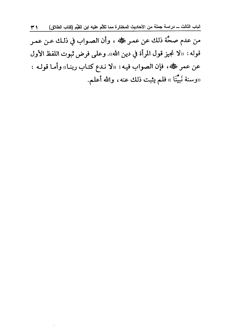 من عدم صحَّة ذلك عن عمر رضي الله عنه، وأن الصواب في ذلك عن عمر قوله: "لا نجيز قول المرأة في دين الله". وعلى فرض ثبوت اللفظ الأول عن عمر رضي الله عنه، فإن الصواب فيه: "لا ندع كتاب ربنا" وأما قوله: "وسنة نَبيِّنَا" فلم يثبت ذلك عنه، والله أعلم.