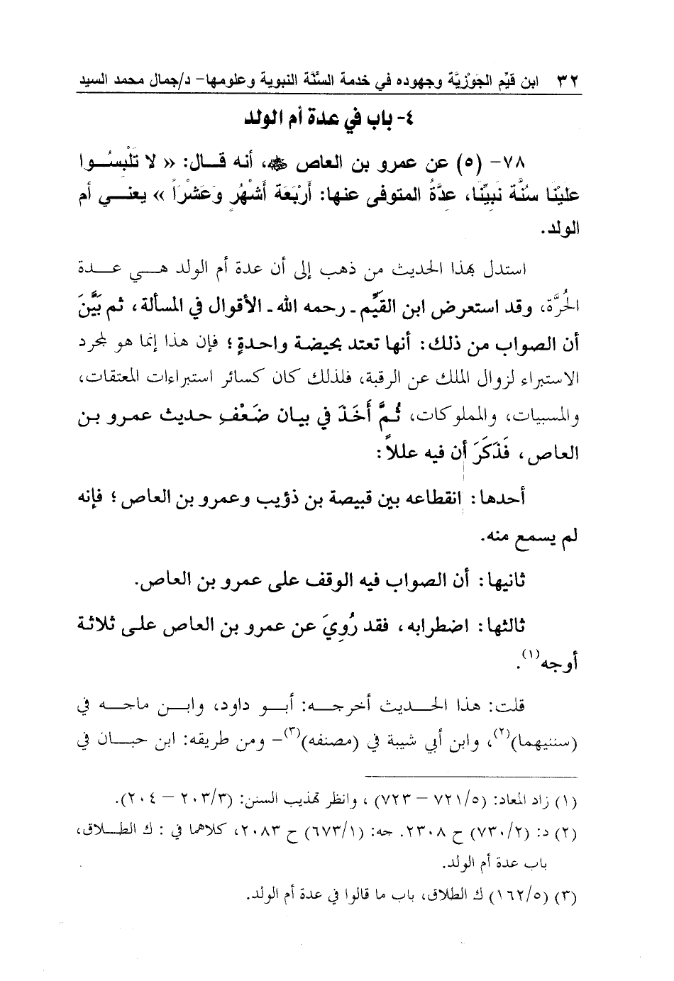 78- (5) عن عمرو بن العاص رضي الله عنه، أنه قال: "لا تَلْبِسُوا عَلَيْنَا سُنَّة نَبِيِّنَا، عِدَّةُ المتوفى عنها: أَرْبَعَة أَشْهُرٍ وَعَشْرَاً" يعني أم الولد.