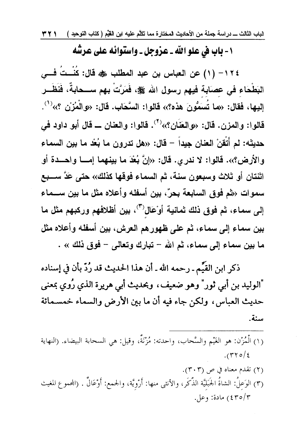 124- (1) عن العباس بن عبد المطلب رضي الله عنه قال: كُنْتُ في البَطْحَاءِ في عِصَابِةٍ فيهم رسول الله صلى الله عليه وسلم، فَمَرَّتْ بهم سحابةٌ، فَنَظَر إليها، فقال: "ما تُسَمُّونَ هذه؟ " قالوا: السَّحَاب. قال: "والْمُزْن؟ " 1. قالوا: والمزن. قال: "والعَنَان؟ " 2. قالوا: والعنان - قال أبو داود في حديثه: لم أَتْقنْ العنان جيداً - قال: "هل تدرون ما بُعْد ما بين السماء والأرض؟ ". قالوا: لا ندري. قال: "إنَّ بُعْدَ ما بينهما إما واحدة أو اثنتان أو ثلاث وسبعون سنة، ثم السماء فوقها كذلك" حتى عَدَّ سبع سموات "ثم فوق السابعة بحرٌ، بين أسفله وأعلاه مثل ما بين سماء إلى سماء، ثم فوق ذلك ثمانية أوْعَالٍ3، بين أظلافهم وركبهم مثل ما بين سماء إلى سماء، ثم على ظهورهم العرش، بين أسفله وأعلاه مثل ما بين سماء إلى سماء، ثم الله - تبارك وتعالى - فوق ذلك".