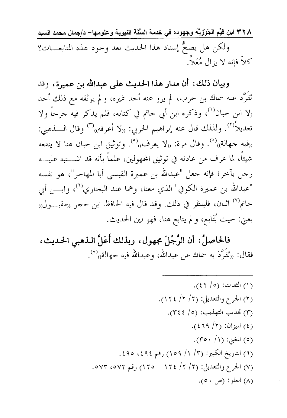 وبيان ذلك: أن مدار هذا الحديث على عبد الله بن عميرة، وقد تَفَرَّد عنه سماك بن حرب، لم يرو عنه أحد غيره، ولم يوثقه مع ذلك أحد إلا ابن حبان1، وذكره ابن أبي حاتم في كتابه، فلم يذكر فيه جرحاً ولا تعديلاً2. ولذلك قال عنه إبراهيم الحربي: "لا أعرفه"3 وقال الذهبي: "فيه جهالة"4. وقال مرة: "لا يعرف"5. وتوثيق ابن حبان هنا لا ينفعه شيئاً، لما عرف من عادته في توثيق المجهولين، علماً بأنه قد اشتبه عليه رجل بآخر؛ فإنه جعل "عبد الله بن عميرة القيسي أبا المهاجر"، هو نفسه "عبد الله بن عميرة الكوفي" الذي معنا، وهما عند البخاري6، وابن أبي حاتم7 اثنان، فلينظر في ذلك. وقد قال فيه الحافظ ابن حجر "مقبول" يعني: حيث يُتَابع، ولم يتابع هنا، فهو لين الحديث.