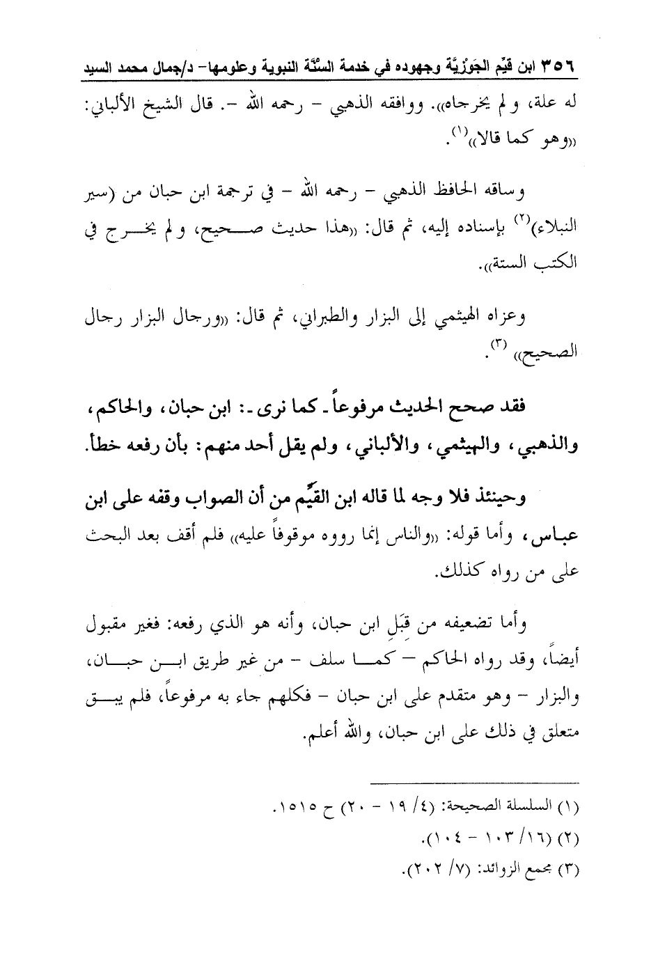 وأما تضعيفه من قِبَلِ ابن حبان، وأنه هو الذي رفعه: فغير مقبول أيضاً، وقد رواه الحاكم – كما سلف - من غير طريق ابن حبان، والبزار - وهو متقدم على ابن حبان - فكلهم جاء به مرفوعاً، فلم يبق متعلق في ذلك على ابن حبان، والله أعلم.