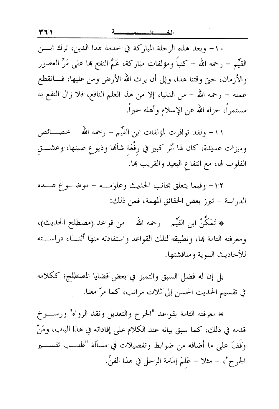 11- ولقد توافرت لمؤلفات ابن القَيِّم - رحمه الله - خصائص وميزات عديدة، كان لها أثر كبير في رِفْعَةِ شأنها وذيوعِ صيتها، وعشقِ القلوب لها، مع انتفاعِ البعيد والقريب بها.
