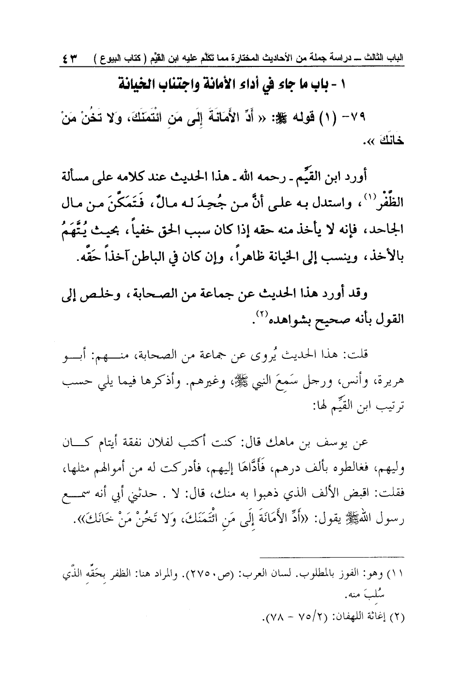 79- (1) قوله صلى الله عليه وسلم: "أَدِّ الأَمَانَةَ إِلَى مَنِ ائْتَمَنَكَ، وَلا تَخُنْ مَنْ خَانَكَ".