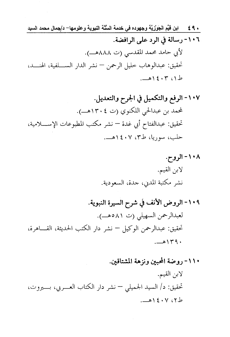 لأبي حامد محمد المقدسي (ت 888هـ) . تحقيق: عبد الوهاب خليل الرحمن - نشر الدار السلفية، الهند، ط1، 1403هـ.
