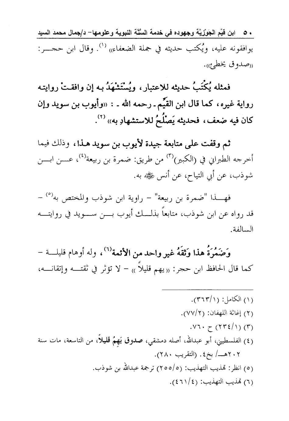 فمثله يُكْتَبُ حديثه للاعتبار، ويُسْتَشْهَدُ به إن وافقتْ روايته رواية غيره، كما قال ابن القَيِّم - رحمه الله -: "وأيوب بن سويد وإن كان فيه ضعف، فحديثه يَصْلُحُ للاستشهادِ به"2.