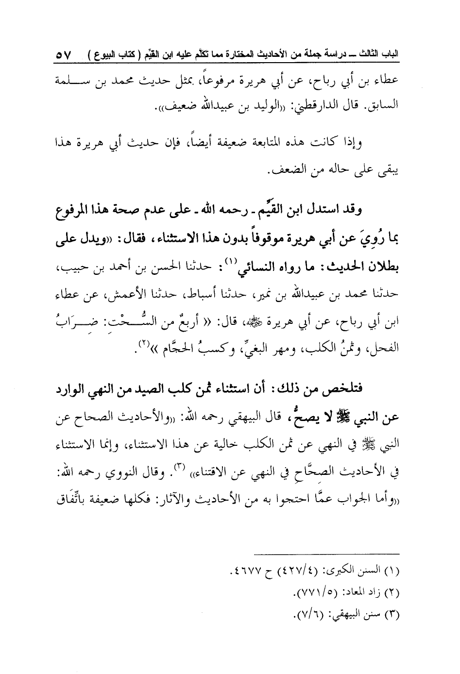 فتلخص من ذلك: أن استثناء ثمن كلب الصيد من النهي الوارد عن النبي صلى الله عليه وسلم لا يصحُّ، قال البيهقي رحمه الله: "والأحاديث الصحاح عن النبي صلى الله عليه وسلم في النهي عن ثمن الكلب خالية عن هذا الاستثناء، وإنما الاستثناء في الأحاديث الصِحَّاحِ في النهي عن الاقتناء"3. وقال النووي رحمه الله: "وأما الجواب عمَّا احتجوا به من الأحاديث والآثار: فكلها ضعيفة باتِّفَاق