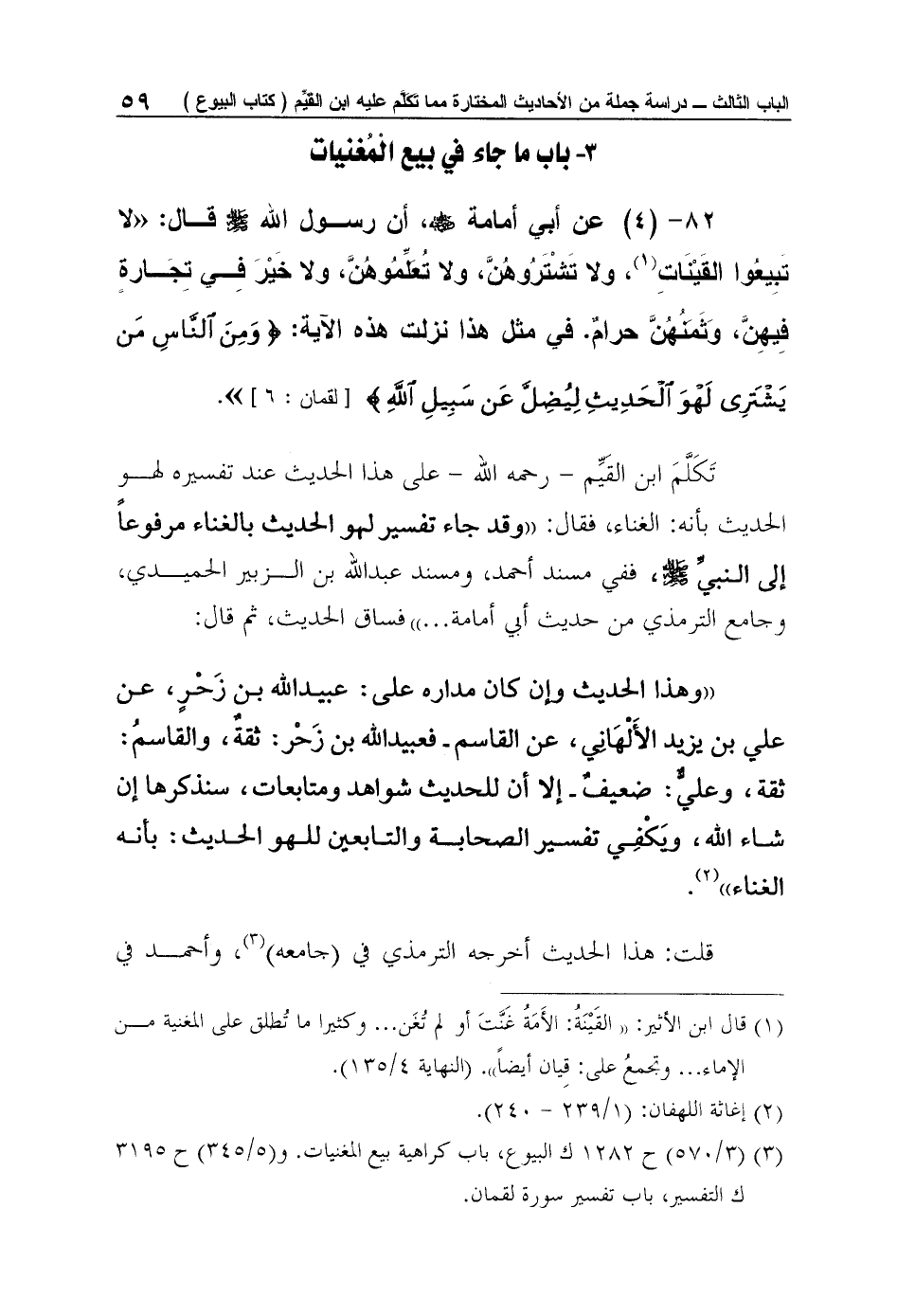 82- (4) عن أبي أمامة رضي الله عنه، أن رسول الله صلى الله عليه وسلم قال: "لا تَبِيعُوا القَيْنَاتِ1، ولا تَشْتَرُوهُنَّ، ولا تُعَلِّمُوهُنَّ، ولا خَيْرَ فِي تِجَارةٍ فِيهِنَّ، وَثَمَنُهُنَّ حرامٌ. في مثل هذا نزلت هذه الآية: {وَمِنَ النَّاسِ مَنْ يَشْتَرِي لَهْوَ الْحَدِيثِ لِيُضِلَّ عَنْ سَبِيلِ اللَّهِ} [لقمان: 6] ".