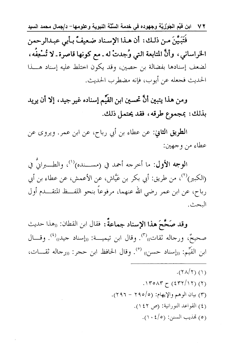 ومن هذا يتبين أنَّ تحسين ابن القَيِّم إسناده غير جيد، إلا أن يريد بذلك: بمجموع طرقه، فقد يحتمل ذلك.