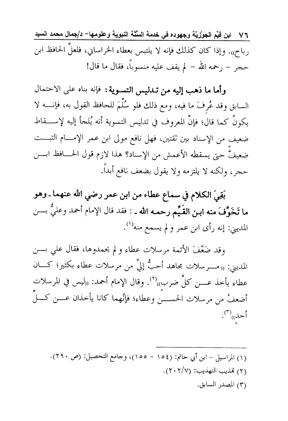 بَقِيَ الكلام في سماع عطاء من ابن عمر رضي الله عنهما - وهو ما تَخَوَّفَ منه ابن القَيِّم رحمه الله -: فقد قال الإمام أحمد وعليُّ بن المديني: إنه رأى ابن عمر ولم يسمع منه1.