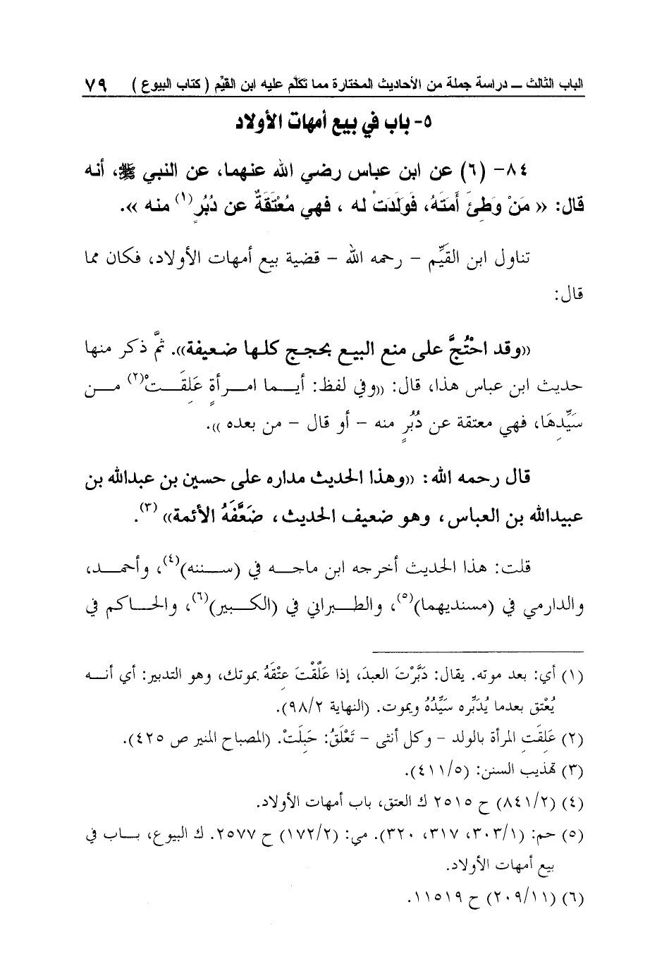 84- (6) عن ابن عباس رضي الله عنهما، عن النبي صلى الله عليه وسلم، أنه قال: "مَنْ وَطِئَ أَمَتَهُ، فَوَلَدَتْ له، فهي مُعْتَقَةٌ عن دُبُرٍ1 منه".