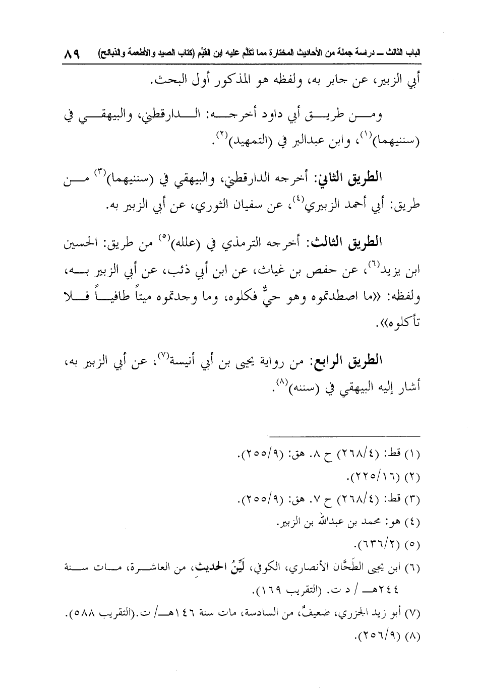 الطريق الثالث: أخرجه الترمذي في (علله) 5 من طريق: الحسين ابن يزيد6، عن حفص بن غياث، عن ابن أبي ذئب، عن أبي الزبير به، ولفظه: "ما اصطدتموه وهو حيٌّ فكلوه، وما وجدتموه ميتاً طافياً فلا تأكلوه".
