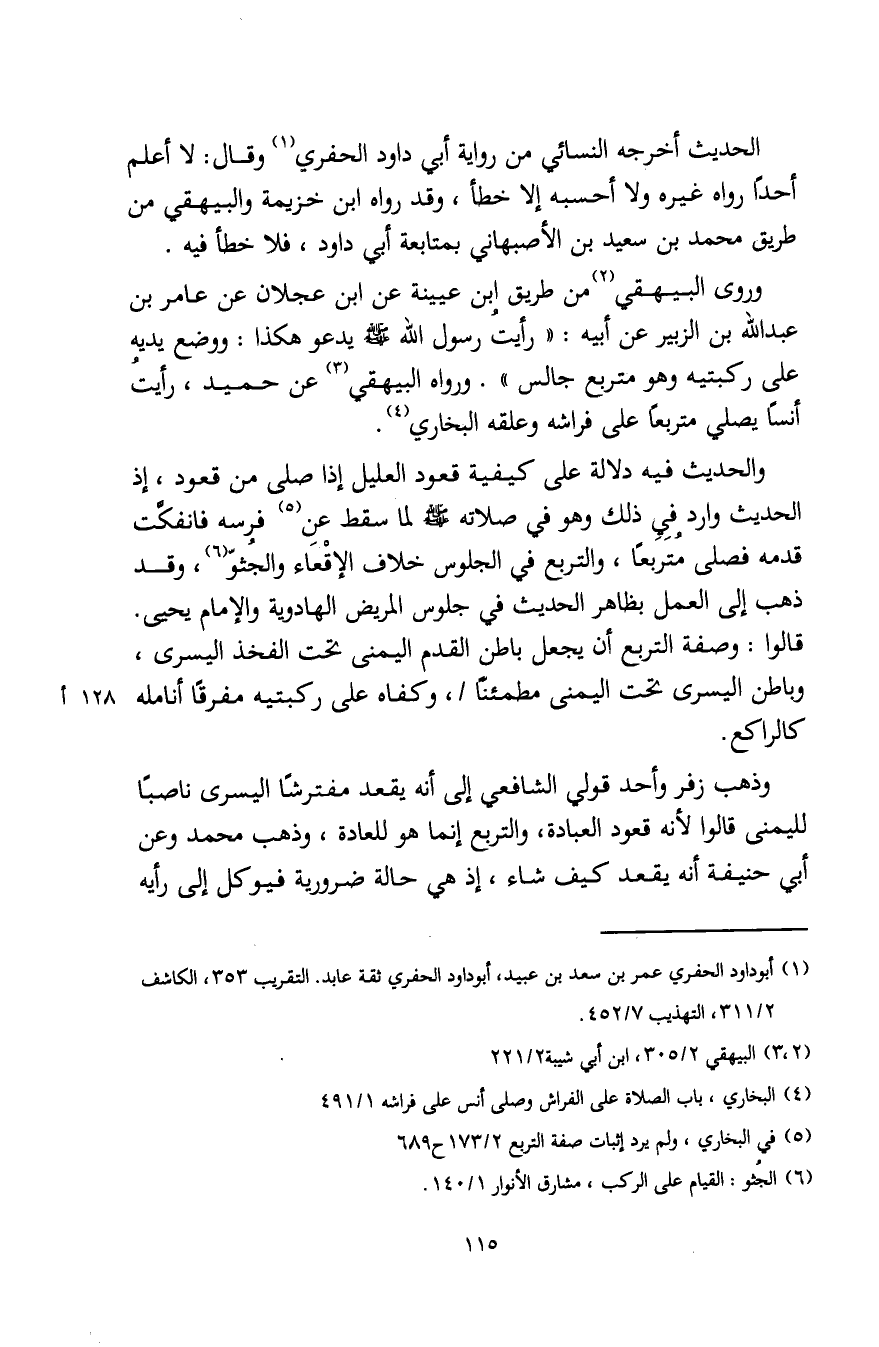 وروى البيهقي (¬2) من طريق ابن عيينة عن ابن عجلان عن عامر بن عبد الله بن الزبير عن أبيه: "رأيت رسول الله - صلى الله عليه وسلم - يدعو هكذا: ووضع يديه على ركبتيه وهو متربع جالس". ورواه البيهقي (¬3) عن حميد، رأيتُ أنسًا يصلي متربعًا على فراشه وعلقه البخاري (¬4).