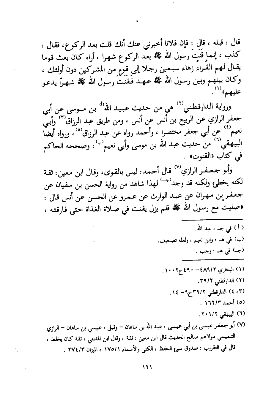 ورواية الدارقطني (¬2) هي من حديث عبيد الله (أ) بن موسى عن أبي جعفر الرازي عن الربيع بن أنس عن أنس، ومن طريق عبد الرزاق (¬3) وأبي نعيم (¬4) عن أبي جعفر مختصرًا، وأحمد رواه عن عبد الرزاق (¬5)، ورواه أيضًا البيهقي (¬6) من حديث عبد الله بن موسى وأبي نعيم (ب)، وصححه الحاكم في كتاب "القنوت".