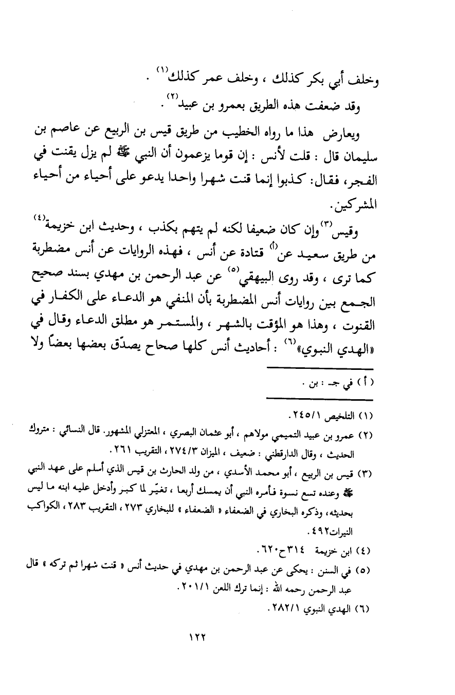 (¬5) في السنن: يحكى عن عبد الرحمن بن مهدي في حديث أنس "قنت شهرا ثم تركه" قال عبد الرحمن رحمه الله: إنما ترك اللعن 1/ 201.