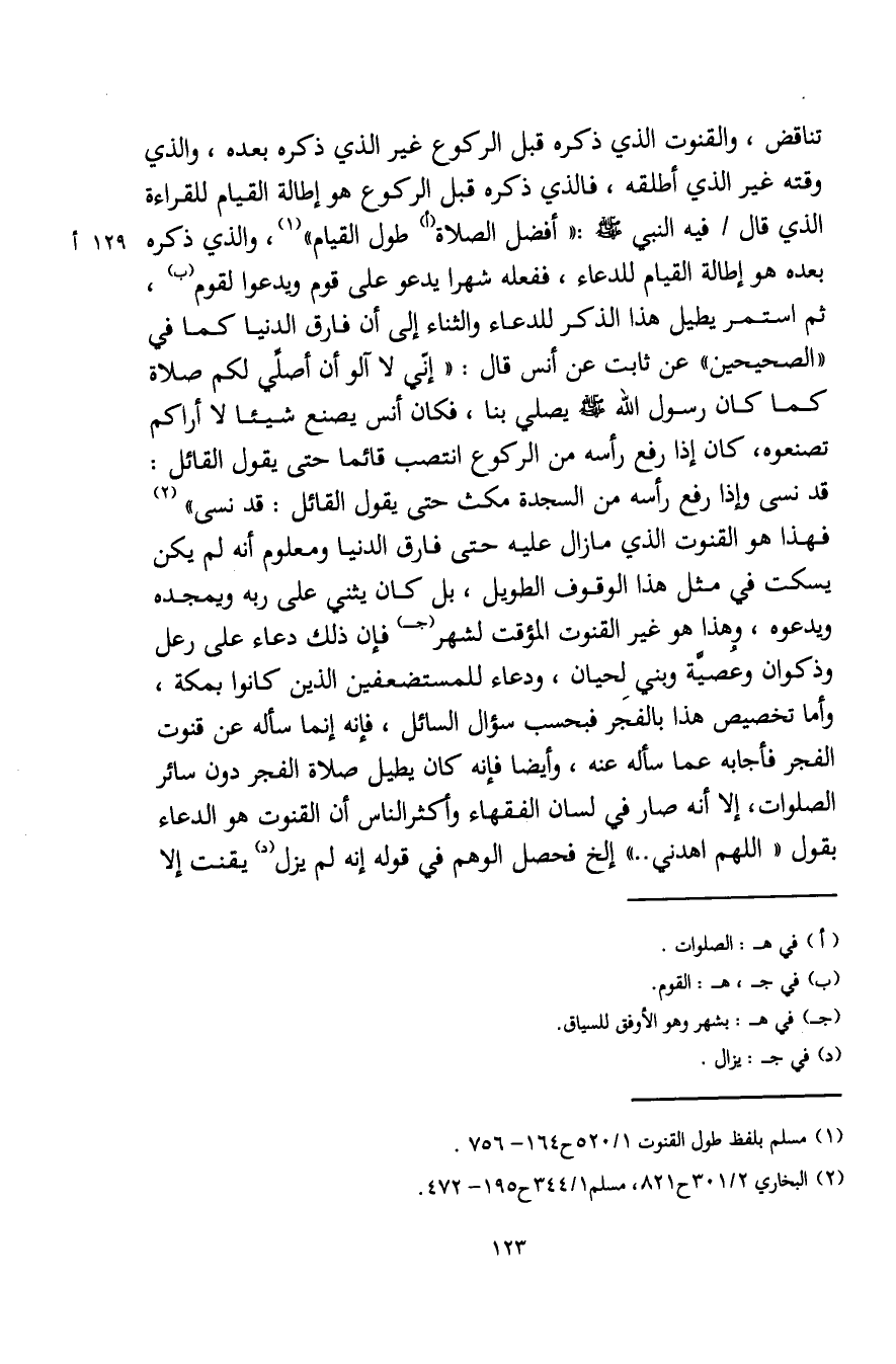 تناقض، والقنوت الذي ذكره قبل الركوع غير الذي ذكره بعده، والذي وقته غير الذي أطلقه، فالذي ذكره قبل الركوع هو إطالة القيام للقراءة الذي قال فيه النبي - صلى الله عليه وسلم -: "أفضل الصلاة (أ) طول القيام" (¬1)، والذي ذكره بعده هو إطالة القيام للدعاء، ففعله شهرا يدعو على قوم ويدعوا لقوم (ب)، ثم استمر يطيل هذا الذكر للدعاء والثناء إلى أن فارق الدنيا كما في "الصحيحين" عن ثابت عن أنس قال: "إني لا آلو أن أصلي لكم صلاة كما كان رسول الله - صلى الله عليه وسلم - يصلي بنا، فكان أنس يصنع شيئًا لا أراكم تصنعوه، كان إذا رفع رأسه من الركوع انتصب قائما حتى يقول القائل: قد نسى وإذا رفع رأسه من السجدة مكث حتى يقول القائل: قد نسى" (¬2) فهذا هو القنوت الذي ما زال عليه حتى فارق الدنيا ومعلوم أنه لم يكن يسكت في مثل هذا الوقوف الطويل، بل كان يثني على ربه ويمجده ويدعوه، وهذا هو غير القنوت المؤقت لشهر (جـ) فإن ذلك دعاء على رعل وذكوان وعُصيَّة وبني لحيان، ودعاء للمستضعفين الذين كانوا بمكة، وأما تخصيص هذا بالفجر فبحسب سؤال السائل، فإنه إنما سأله عن قنوت الفجر فأجابه عما سأله عنه، وأيضًا فإنه كان يطيل صلاة الفجر دون سائر الصلوات، إلا أنه صار في لسان الفقهاء وأكثر الناس أن القنوت هو الدعاء بقول "اللهم اهدني .. " إلخ فحصل الوهم في قوله إنه لم يزل (د) يقنت إلا