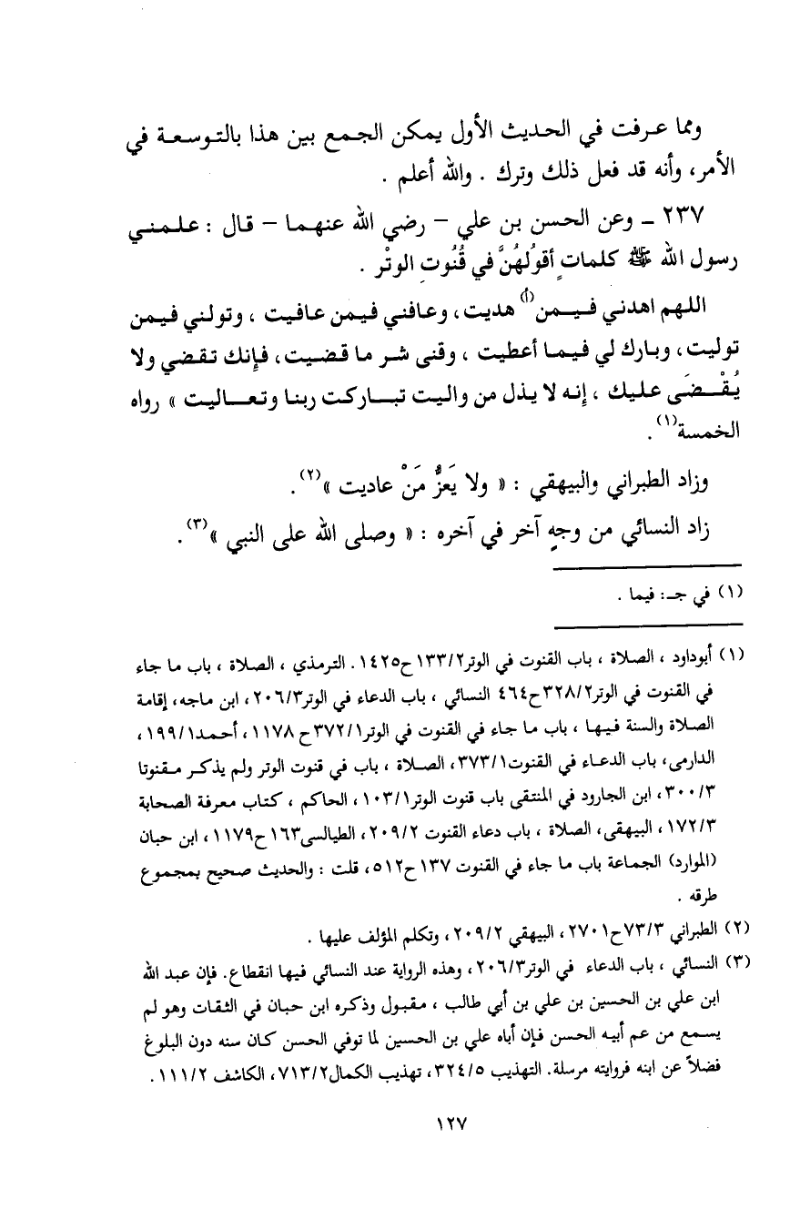 (¬3) النسائي، باب الدعاء في الوتر 3/ 206، وهذه الرواية عند النسائي فيها انقطاع. فإن عبد الله بن علي بن الحسين بن علي بن أبي طالب، قبول وذكره ابن حبان في الثقات وهو لم يسمع من عم أبيه الحسن فإن أباه علي بن الحسين لما توفي الحسن كان سنه دون البلوغ فضلًا عن ابنه فروايته مرسلة. التهذيب 5/ 324، تهذيب الكمال 2/ 713، الكاشف 2/ 111.