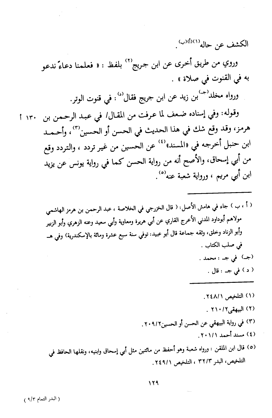 (¬5) قال ابن الملقن: ورواه شعبة وهو أحفظ من مائتين مثل أبي إسحاق وابنيه، ونقلها الحافظ في التلخيص، البدر 3/ 32، التلخيص 1/ 249.