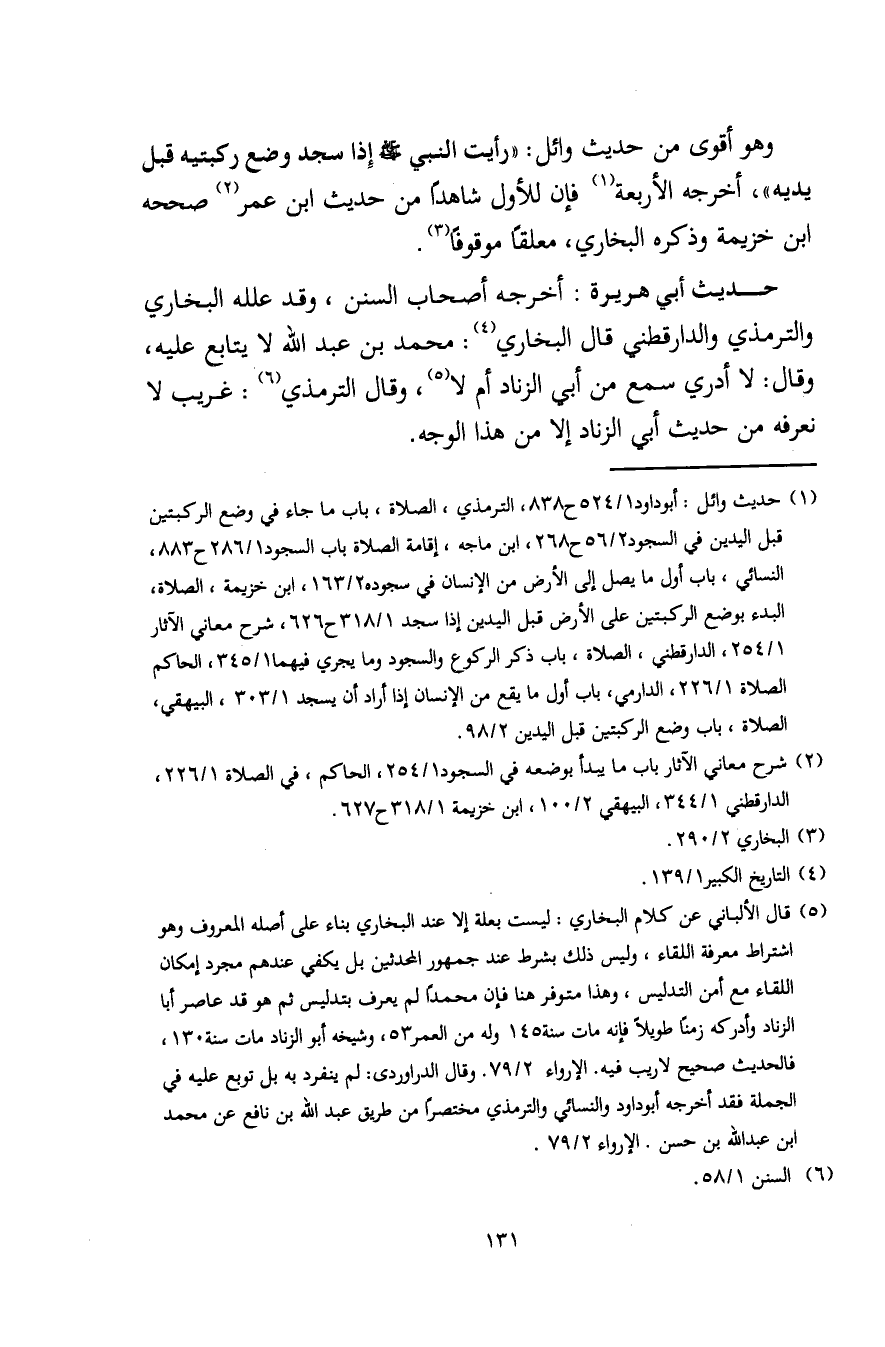 (¬1) حديث وائل: أبو داود 1/ 524 ح 838، الترمذي، الصلاة، باب ما جاء في وضع الركبتين قبل اليدين في السجود 2/ 56 ح 268، ابن ماجه، إقامة الصلاة باب السجود 1/ 286 ح 883، النسائي، باب أول ما يصل إلى الأرض من الإنسان في سجوده 2/ 163، ابن خزيمة، الصلاة، البدء بوضع الركبتين على الأرض قبل اليدين إذا سجد 1/ 318 ح 626، شرح معاني الآثار 1/ 254، الدارقطني، الصلاة، باب ذكر الركوع والسجود وما يجري فيهما 1/ 345، الحاكم الصلاة 1/ 226، الدارمي، باب أول ما يقع من الإنسان إذا أراد أن يسجد 1/ 303، البيهقي، الصلاة، باب وضع الركبتين قبل اليدين 2/ 98.