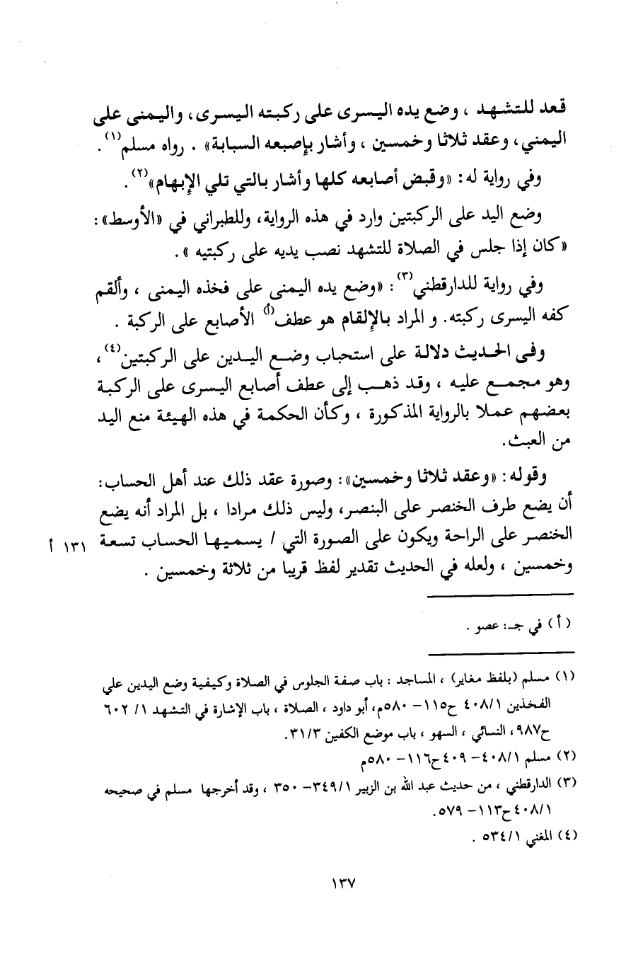 (¬1) مسلم (بلفظ مغاير)، المساجد: باب صفة الجلوس في الصلاة وكيفية وضع اليدين على الفخذين 1/ 408 ح 115 - 580 م، أبو داود، الصلاة، باب الإشارة في التشهد 1/ 602 ح 987، النسائي، السهو، باب موضع الكفين 3/ 31.