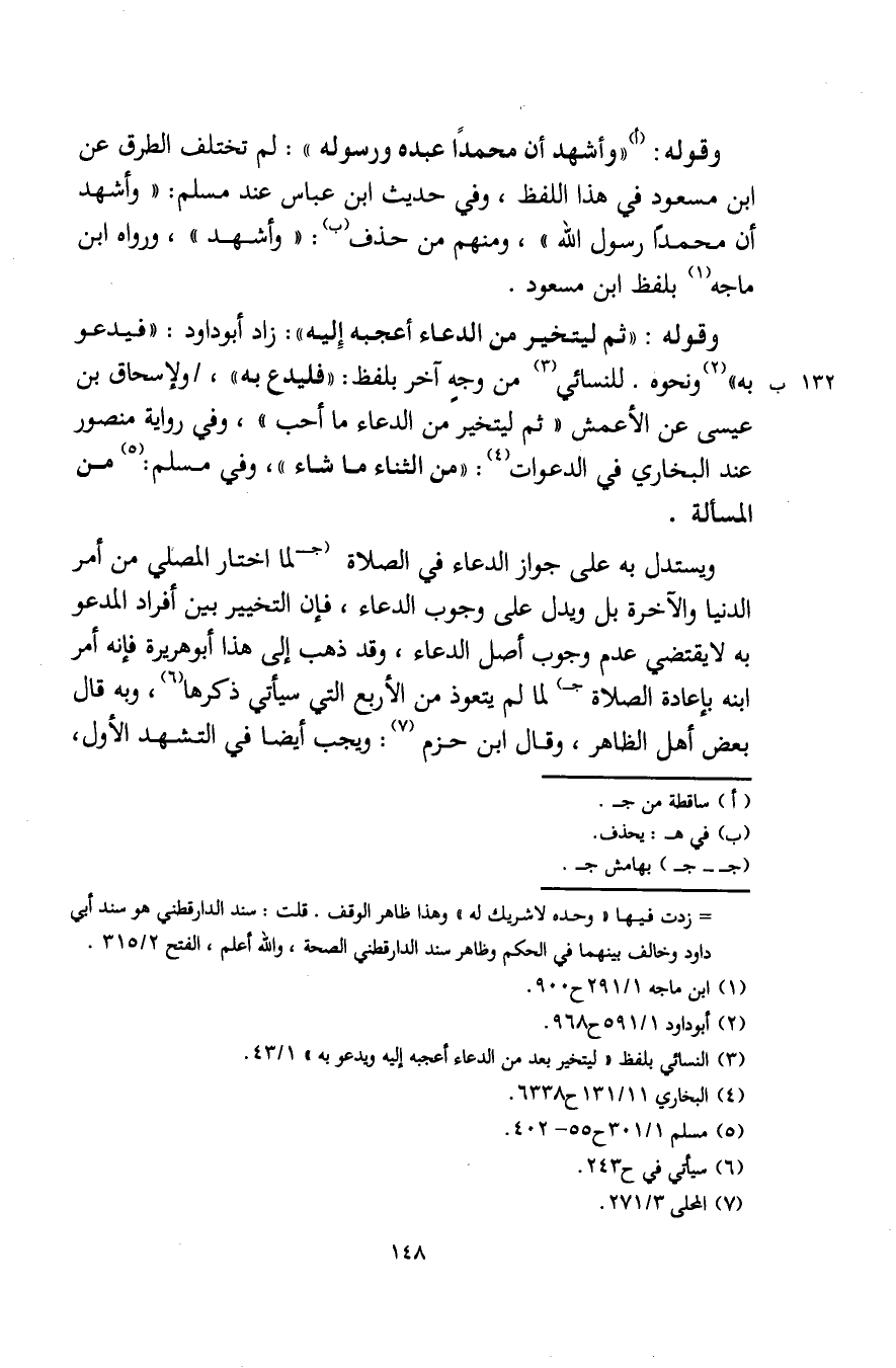 وقوله: (أ) "وأشهد أن محمدًا عبده ورسوله": لم تختلف الطرق عن ابن مسعود في هذا اللفظ، وفي حديث ابن عباس عند مسلم: "وأشهد أن محمدًا رسول الله"، ومنهم من حذف (ب): "وأشهد"، ورواه ابن ماجه (¬1) بلفظ ابن مسعود.