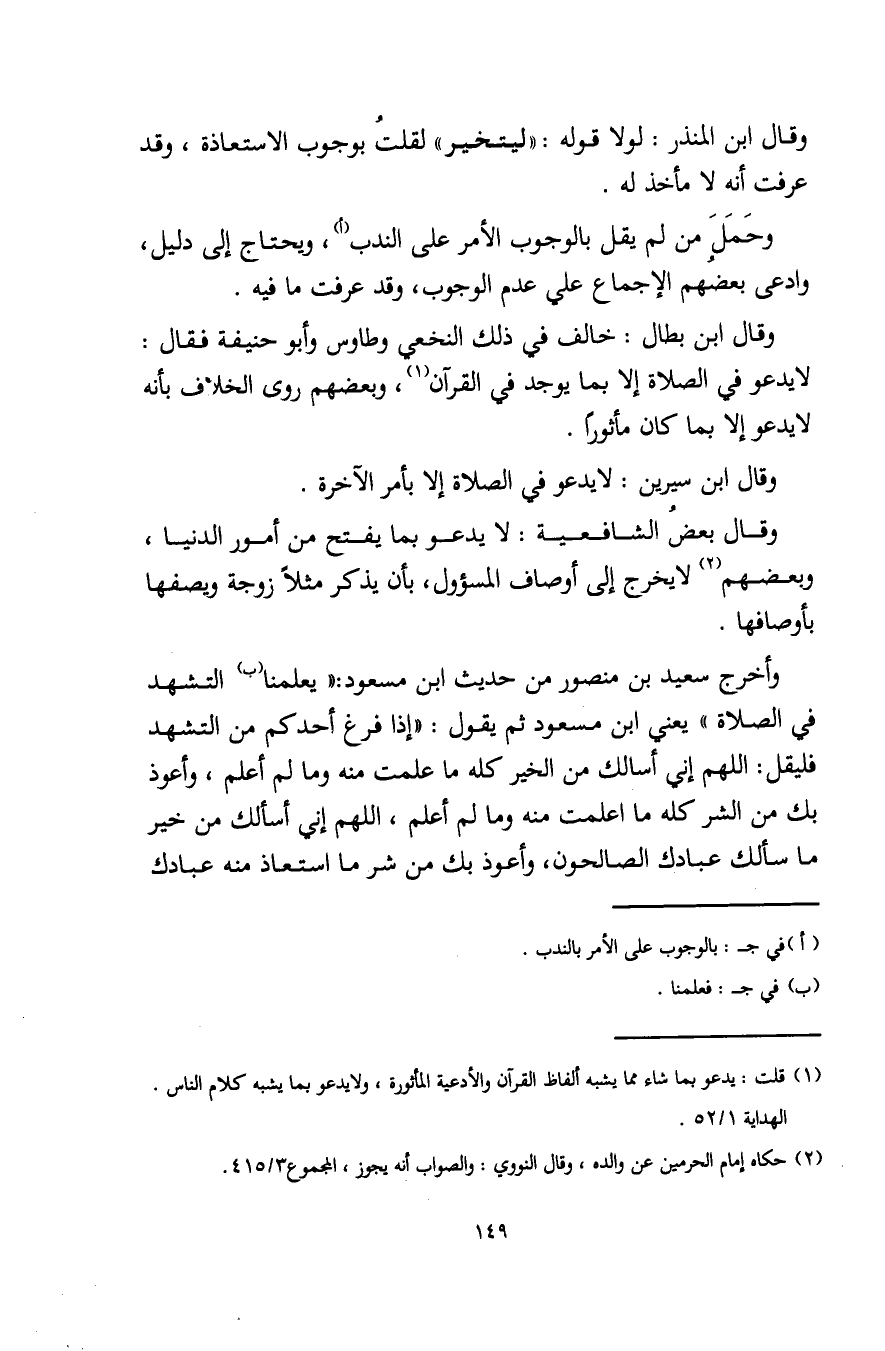 وأخرج سعيد بن منصور من حديث ابن مسعود: "يعلمنا (ب) التشهد في الصلاة" يعني ابن مسعود ثم يقول: "إذا فرغ أحدكم من التشهد فليقل: اللهم إني أسألك من الخير كله ما علمت منه وما لم أعلم، وأعوذ بك من الشر كله ما اعلمت منه وما لم أعلم، اللهم إني أسألك من خير ما سألك عبادك الصالحون، وأعوذ بك من شر ما استعاذ منه عبادك