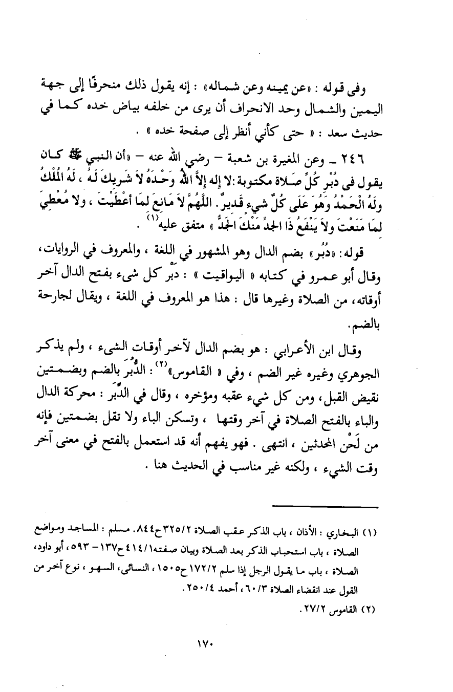 (¬1) البخاري: الأذان، باب الذكر عقب الصلاة 2/ 325 ح 844. مسلم: المساجد ومواضع الصلاة، باب استحباب الذكر بعد الصلاة وبيان صفته 1/ 414 ح 137 - 593، أبو داود، الصلاة، باب ما يقول الرجل إذا سلم 2/ 172 ح 1505، النسائي، السهو، نوع آخر من القول عند انقضاء الصلاة 3/ 60، أحمد 4/ 250.