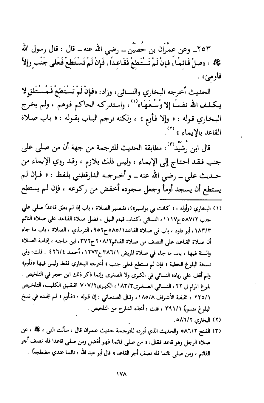 (¬3) الفتح 2/ 586 والحديث الذي أورده للترجمة حديث عمران قال: سألت النبي - صلى الله عليه وسلم -، عن صلاة الرجل وهو قاعد فقال: "من صلى قائما فهو أفضل ومن صلى قاعدا فله نصف أجر القائم، ومن صلى نائما فله نصف أجر القاعد" قال أبو عبد اللَّه: نائما عندي مضطجًا.