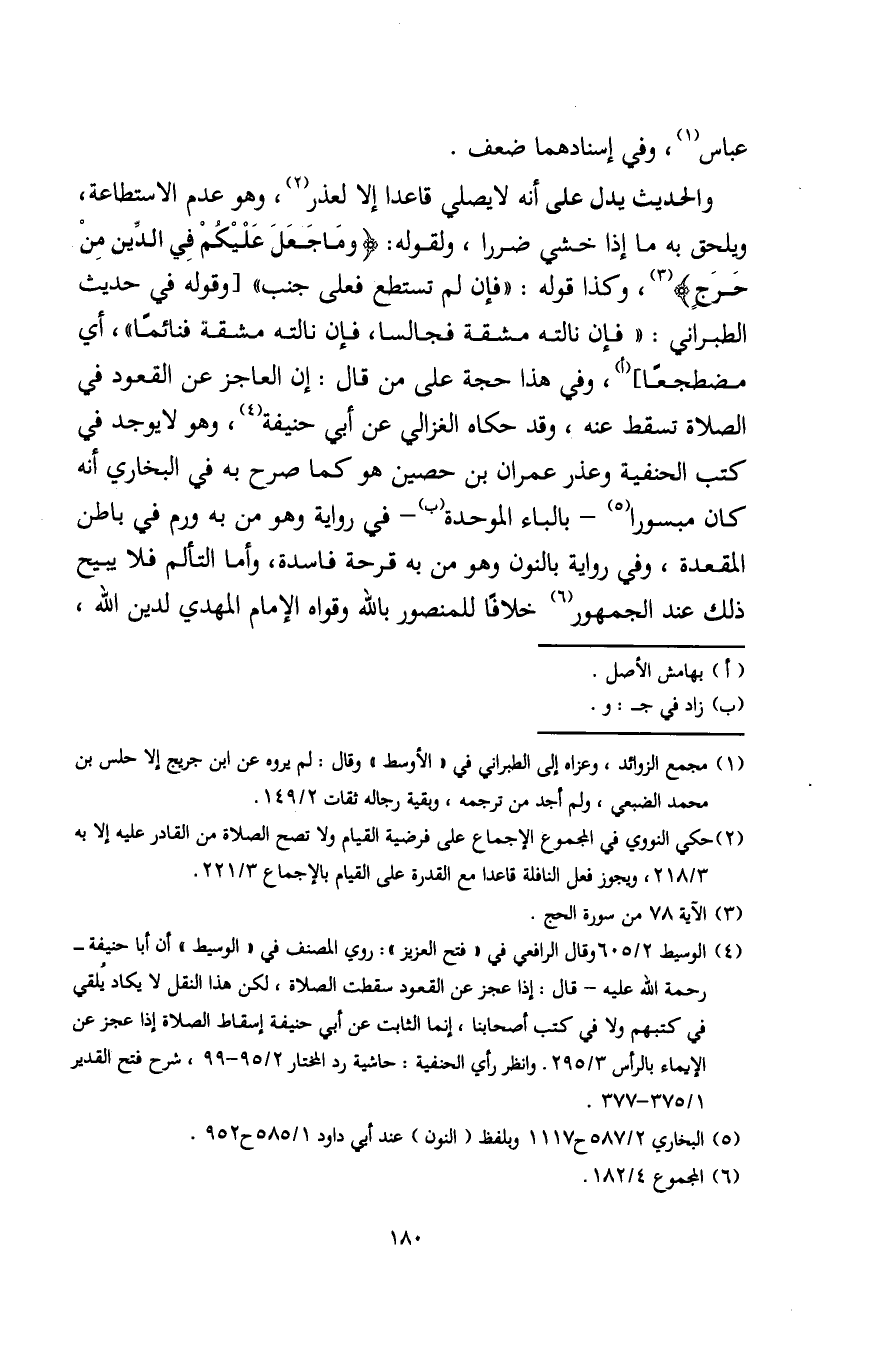 والحديث يدل على أنه لا يصلي قاعدا إلا لعذر (¬2)، وهو عدم الاستطاعة، ويلحق به ما إذا خشي ضررا، ولقوله: {وَمَا جَعَلَ عَلَيْكُمْ فِي الدِّينِ مِنْ حَرَجٍ} (¬3)، وكذا قوله: "فإن لم تستطع فعلى جنب" [وقوله في حديث الطبراني: "فإن نالته مشقة فجالسا، فإن نالته مشقة فنائمًا"، أي مضطجعًا] (أ)، وفي هذا حجة على من قال: إن العاجز عن القعود في الصلاة تسقط عنه، وقد حكاه الغزالي عن أبي حنيفة (¬4)، وهو لا يوجد في كتب الحنفية وعذر عمران بن حصين هو كما صرح به في البخاري أنه كان مبسورا (¬5) -بالباء الموحدة (ب) - في رواية وهو من به ورم في باطن المقعدة، وفي رواية بالنون وهو من به قرحة فاسدة، وأما التألم فلا يبيح ذلك عند الجمهور (¬6) خلافًا للمنصور باللَّه وقواه الإمام المهدي لدين اللَّه،
