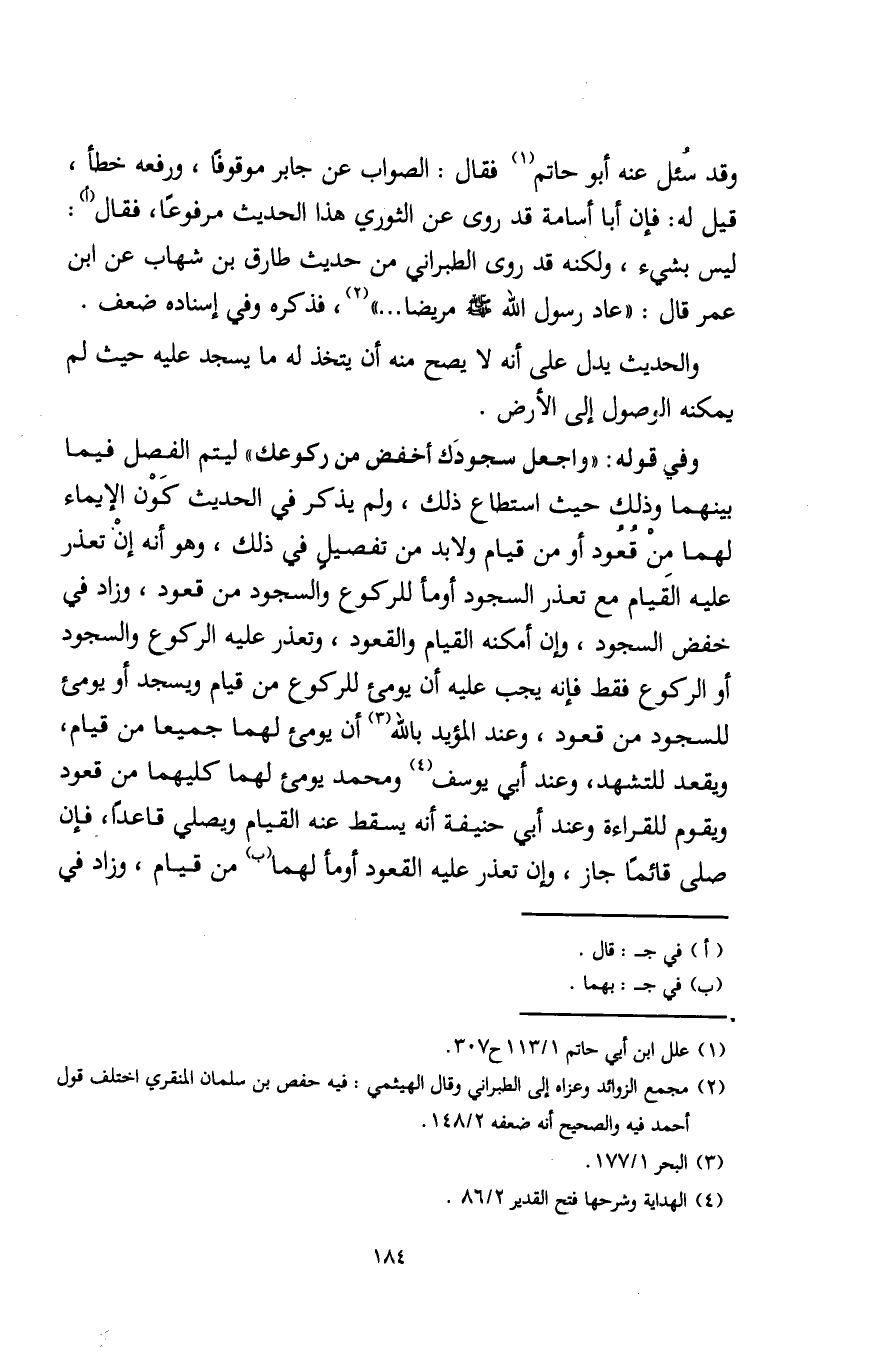 وقد سُئل عنه أبو حاتم (¬1) فقال: الصواب عن جابر موقوفًا، ورفعه خطأ، قيل له: فإن أبا أسامة قد روى عن الثوري هذا الحديث مرفوعًا، فقال (أ): ليس بشيء، ولكنه قد روى الطبراني من حديث طارق بن شهاب عن ابن عمر قال: "عاد رسول اللَّه - صلى الله عليه وسلم - مريضا ... " (¬2)، فذكره وفي إسناده ضعف.
