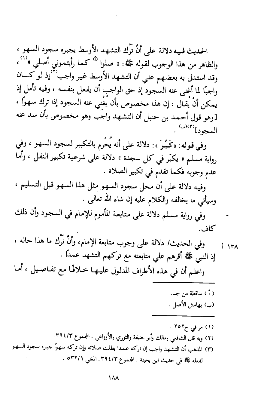 الحديث فيه دلالة على أنَّ تَرْك التشهد الأوسط يجبره سجود السهو، والظاهر من هذا الوجوب لقوله - صلى الله عليه وسلم -: "صلوا (أ) كما رأيتموني أصلي" (¬1)، وقد استدل به بعضهم على أن التشهد الأوسط غير واجب (¬2) إذ لو كان واجبًا لما أغنى عنه السجود إذ حق الواجب أن يفعل بنفسه، وفيه تأمل إذ يمكن أنْ يُقال: إن هذا مخصوص بأن يُغْنِي عنه السجود إذا ترك سهوًا، [وهو قول أحمد بن حنبل أن التشهد واجب وهو مخصوص بأن سد عنه السجود] (¬3) (ب).