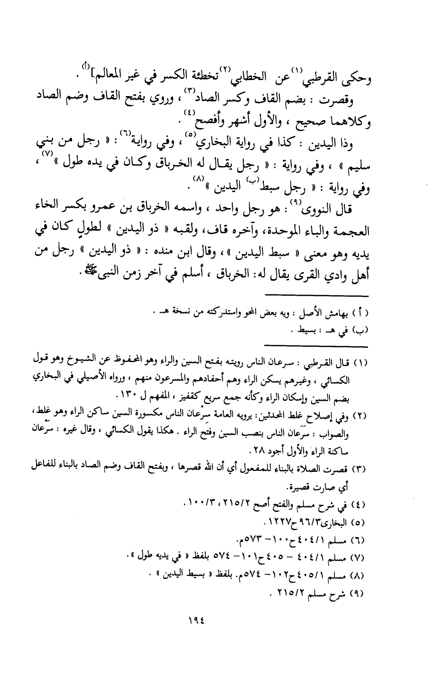 قال النووي (¬9): هو رجل واحد، واسمه الخرباق بن عمرو بكسر الخاء المعجمة والباء الموحدة، وآخره قاف، ولقبه "ذو اليدين" لطولٍ كان في يديه وهو معنى "سبط اليدين"، وقال ابن منده: "ذو اليدين" رجل من أهل وادي القرى يقال له: الخرباق، أسلم في آخر زمن النبي - صلى الله عليه وسلم -.