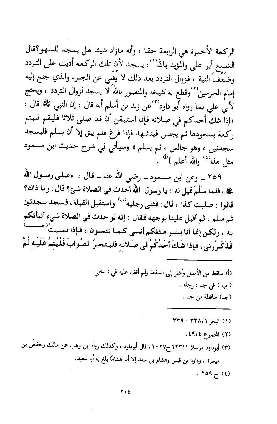 259 - وعن ابن مسعود -رضي اللَّه عنه- قال: "صلى رسول - صلى الله عليه وسلم -، فلما سَلَّمَ قيل له: يا رسول الله أحدث في الصلاة شيء؟ قال: وما ذاك؟ قالوا: صليت كذا، قال: فثنى رجليه (ب) واستقبل القبلة، فسجد سجدتين ثم سلم، ثم أقبل علينا بوجهه فقال: إِنه لو حدث في الصلاة شيء أنبأتكم به، ولكن إِنما أنا بشر مثلكم أنسى كما تنسون، فإِذا نسيتُ (جـ) فَذَكِّروني، فإِذا شَكَّ أحَدُكمْ في صَلاتِهِ فليتحرَّ الصَّوابَ فَلْيتِمَّ عَلَيْهِ ثمَّ