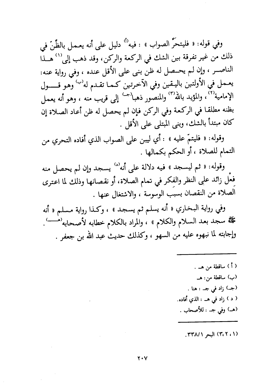 وفي قوله: "فليتحَرَّ الصواب": فيه (أ) دليل على أنه يعمل بالظَّنّ في ذلك من غير تفرقة بين الشك في الركعة والركن، وقد ذهب إلى (¬1) هذا الناصر، وإن لم يحصل له ظن بنى على الأقل عنده، وفي رواية عنه: يعمل في الأولتين باليقين وفي الآخرتين كما تقدم له (ب) وهو قول الإمامية (¬2)، والمؤيد باللَّه (¬3) والمنصور ذهبا (جـ) إلى قريب منه، وهو أنه يعمل بظنه مطلقا في الركعة وفي الركن فإن لم يحصل له ظن أعاد الصلاة إن كان مبتدأ بالشك، وبنى المبتلى على الأقل.