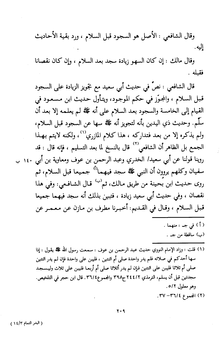 قال الشافعي: نصَّ في حديث أبي سعيد مع تجويز الزيادة على السجود قبل السلام، والمجوّز في حكم الموجود، ويتأول حديث ابن مسعود في القيام إلى الخامسة والسجود بعد السلام على أنه - صلى الله عليه وسلم - لم يعلمه إلا بعد أن سلَّم. وحديث ذي اليدين بأنه لتجويز أنه - صلى الله عليه وسلم - سها عن السجود قبل السلام، ولم يذكره إلا من بعد فتداركه، هذا كلام المازري (¬1)، ولكنه لا يتم بهذا الجمع بل الظاهر أن الشافعي (¬2) قال بالنسخ لما بعد التسليم، فإنه قال: قد روينا قولنا عن أبي سعيد الخدري وعبد الرحمن بن عوف ومعاوية بن أبي سفيان وكلهم يروون أن النبي - صلى الله عليه وسلم - سجد فيهما (أ) جميعا قبل السلام، ثم روى حديث ابن بُحينة من طريق مالك، ثم (ب) قال الشافعي: وفي هذا نقصان، وفي حديث أبي سعيد زيادة، فتبين بذلك أنه سجد فيهما جميعا قبل السلام، وقال في القديم: أخبرنا مطرف بن مازن عن معمر عن