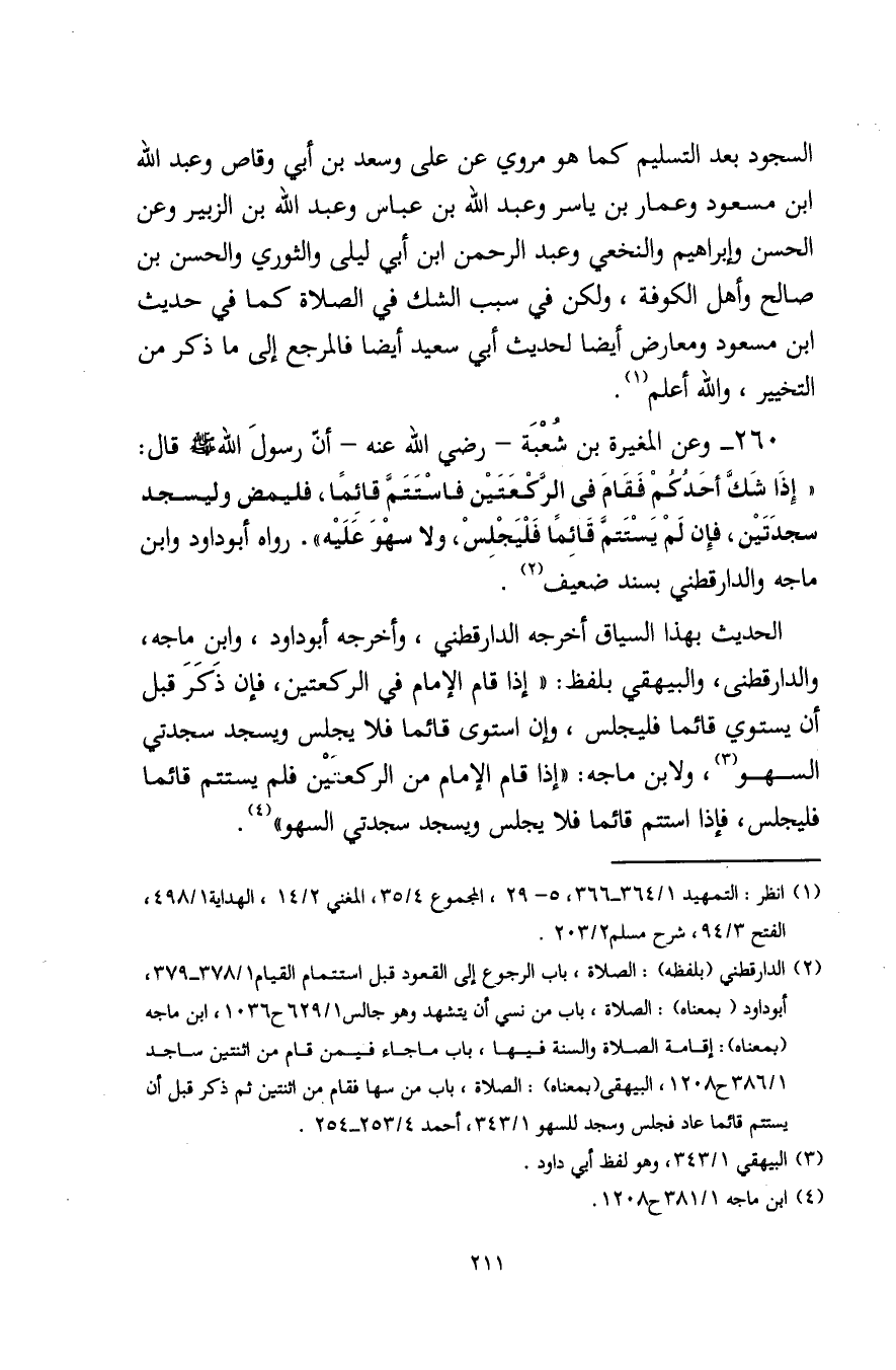 260 - وعن المغيرة بن شعْبَة -رضي اللَّه عنه- أن رسولَ اللَّه - صلى الله عليه وسلم - قال: "إِذَا شَكَّ أحَدُكُم فَقَامَ في الركعَتَيْن فاسْتَتَمَّ قائِمًا، فليمض وليسجد سجدَتَيْن، فإِن لَمْ يسْتَتمَّ قَائِمًا فَلْيَجْلِسْ، ولا سهْوَ عَلَيْه". رواه أبو داود وابن ماجه والدارقطني بسند ضعيف (¬2).