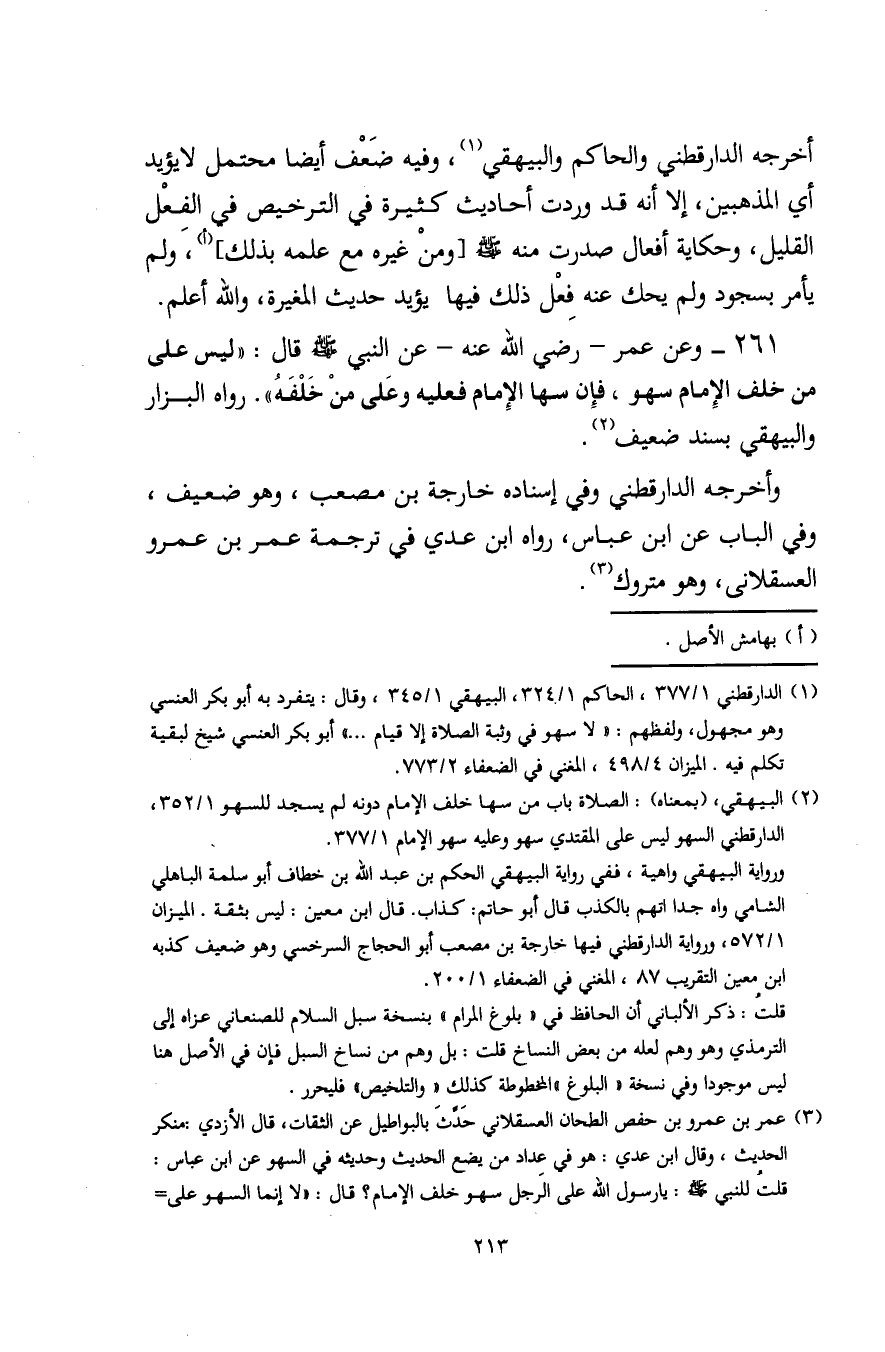 261 - وعن عمر -رضي اللَّه عنه- عن النبي - صلى الله عليه وسلم - قال: "ليس على من خلف الإِمام سهو، فإِن سها الإِمام فعليه وعَلى منْ خَلْفَهُ". رواه البزار والبيهقي بسند ضعيف (¬2).