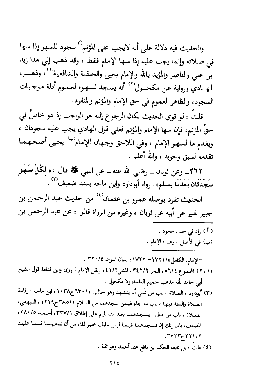 (¬3) أبو داود، الصلاة، باب من نَسي أن يتشهد وهو جالس 1/ 630 ح 1038، ابن ماجه، إقامة الصلاة والسنة فيها، باب ما جاء فيمن سجدهما من السلام 1/ 385 ح 1219، البيهقي، الصلاة، باب من قال: يسجدهما بعد التسليم على إطلاق 1/ 337، أحمد 5/ 280، المصنف، باب إنك إن تسجدهما فيما ليس عليك خير لك من أن تدعهما فيما عليك 2/ 322 ح 3533.